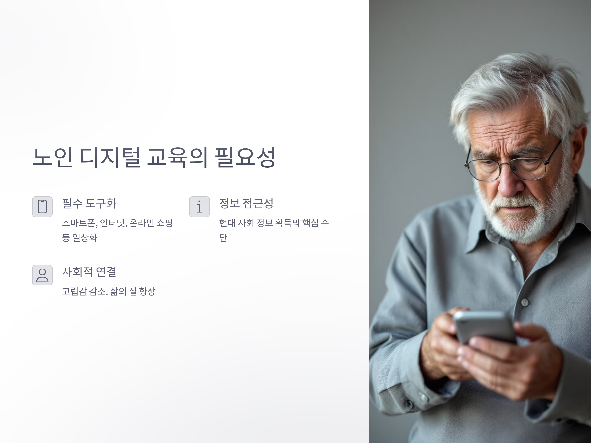 디지털 기술을 활용하는 것은 단순히 기술적인 이해만을 요구하지 않습니다. 현대 사회에서 정보에 접근하고, 사회적 활동을 유지하는 데 중요한 역할을 하기 때문에, 노인들에게 디지털 기기 사용법을 가르치는 교육은 매우 중요합니다. 이러한 교육을 통해 노인들은 혼자서도 스마트폰이나 인터넷을 사용할 수 있게 되어, 다양한 서비스와 정보를 이용할 수 있으며, 사회적 고립감을 줄이고 삶의 질을 향상시킬 수 있습니다.