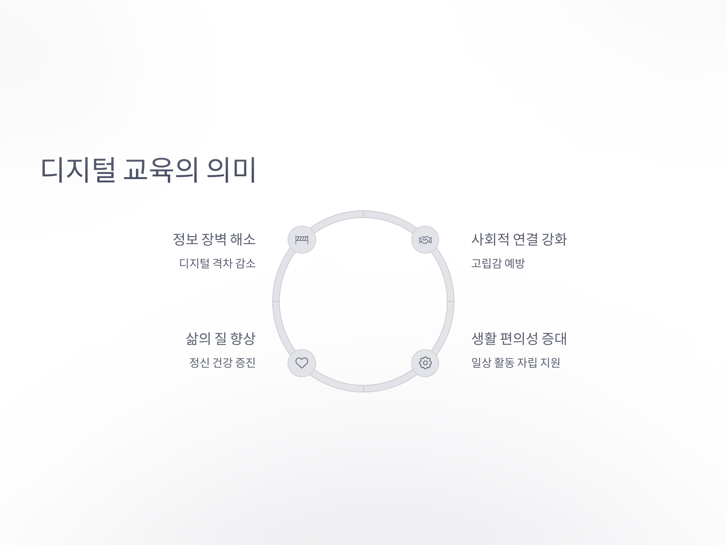따라서 노인이 개별적으로 할 수 있는 부분부터 천천히 배우고, 점차적으로 더 복잡한 기술까지 다룰 수 있도록 돕는 프로그램들이 필요합니다. 이러한 교육은 단기적인 효과뿐만 아니라, 노인의 삶에 오랫동안 긍정적인 영향을 미칠 수 있습니다.