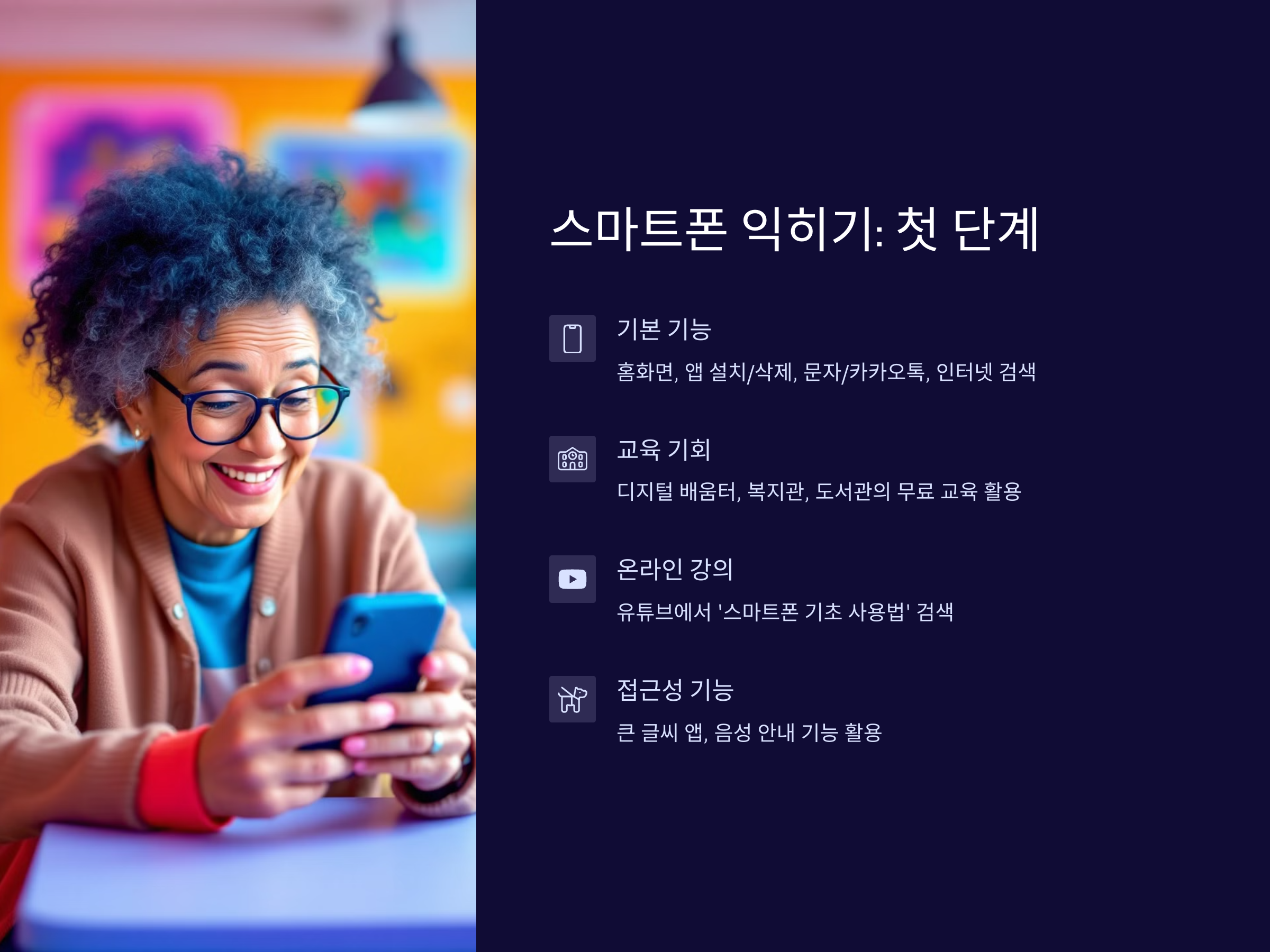 정부의 디지털 배움터나 지자체 복지관, 도서관 등에서 무료 스마트폰 교육을 제공하는 경우가 많으며, 유튜브에서는 '스마트폰 기초 사용법'을 주제로 한 강의들이 쉽게 검색됩니다. 또한, 시니어를 위한 큰 글씨 앱, 음성 안내 기능, 키오스크 체험 앱 등도 활용해보세요. 이러한 기본기를 익히는 것만으로도 일상에서 디지털 접근성이 크게 향상됩니다.