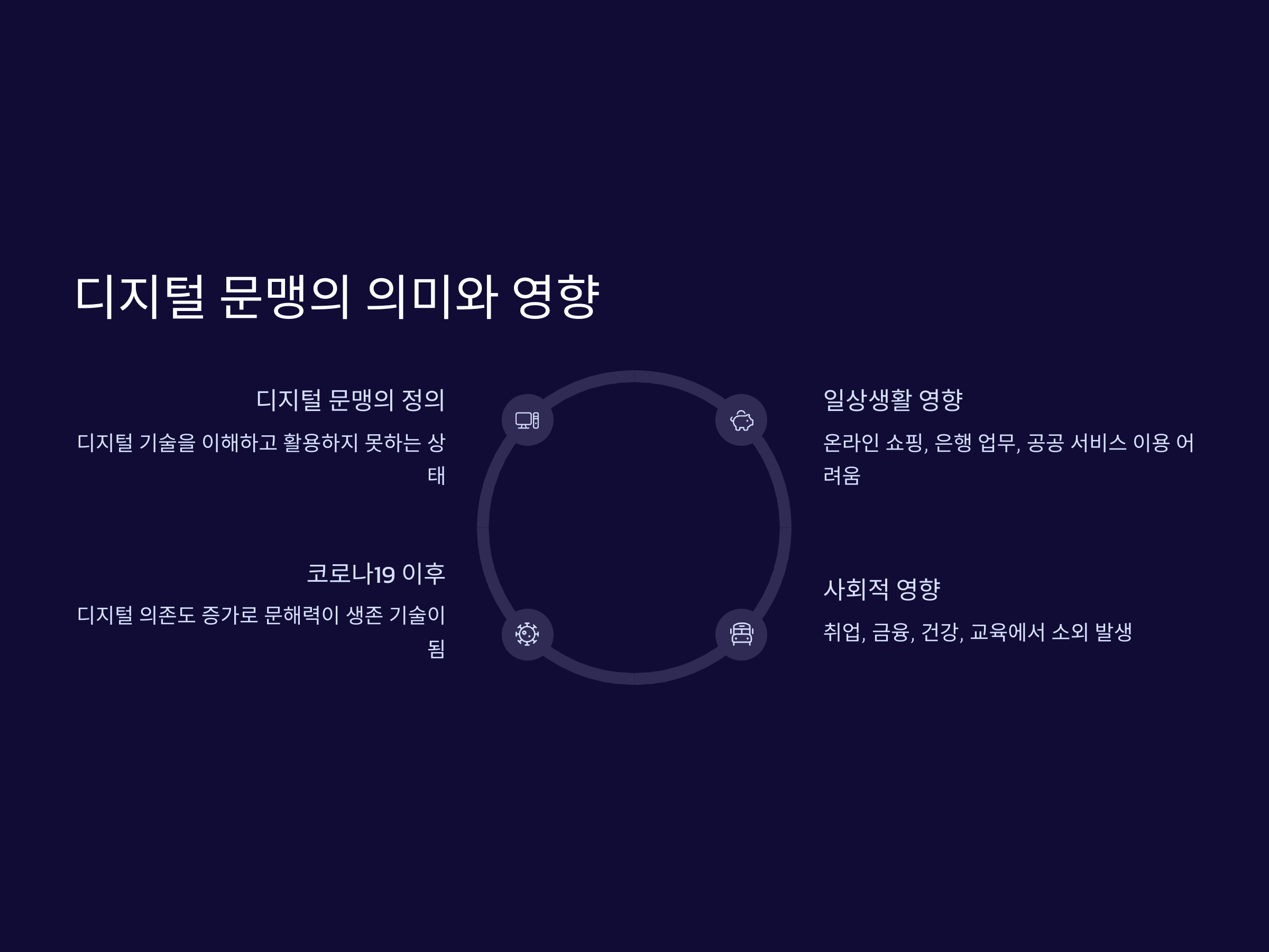 디지털 문맹이란 컴퓨터, 스마트폰, 인터넷 등 디지털 기술을 제대로 이해하지 못하고 활용하지 못하는 상태를 말합니다. 단순히 IT 기기를 못 다루는 수준이 아니라, 전자메일 하나 보내기, 앱 설치하기, 온라인 쇼핑, 은행 업무 등을 할 수 없는 경우도 포함됩니다. 이는 단순한 불편을 넘어서 사회적, 경제적 소외로 이어질 수 있습니다. 예를 들어 공공 서비스 대부분이 디지털화되면서 비대면 신청만 가능한 경우가 많아졌고, 무인 키오스크 도입으로 인해 식사 주문조차 어려운 현실이 생기고 있습니다.