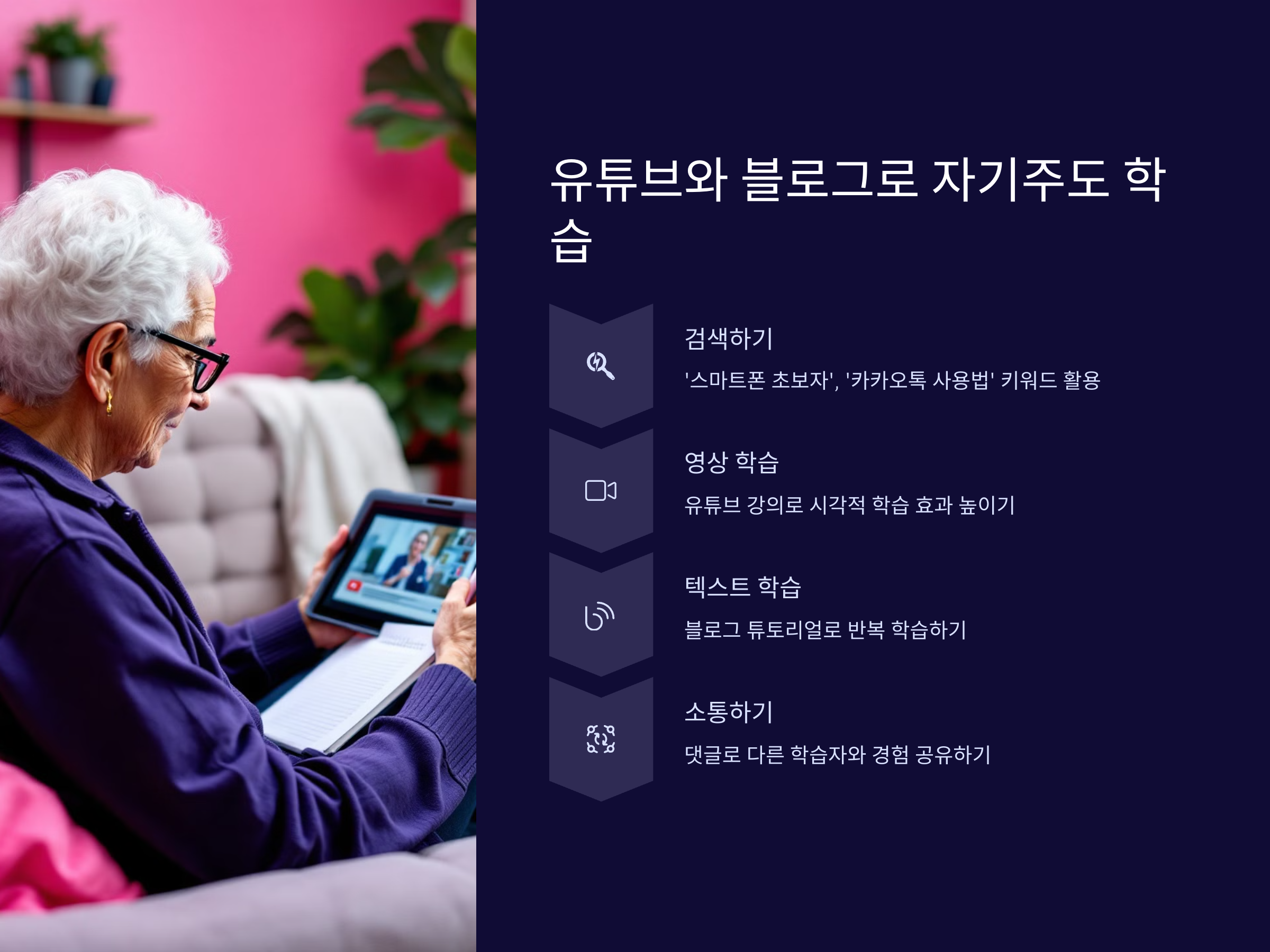 디지털 학습에서 가장 강력한 도구 중 하나는 유튜브입니다. ‘스마트폰 초보자’, ‘카카오톡 사용법’, ‘키오스크 체험’ 같은 키워드만 입력해도 다양한 강의 영상이 나옵니다. 블로그도 마찬가지입니다. 텍스트와 이미지로 정리된 튜토리얼은 언제든 다시 읽고 따라할 수 있어 반복 학습에 탁월합니다.