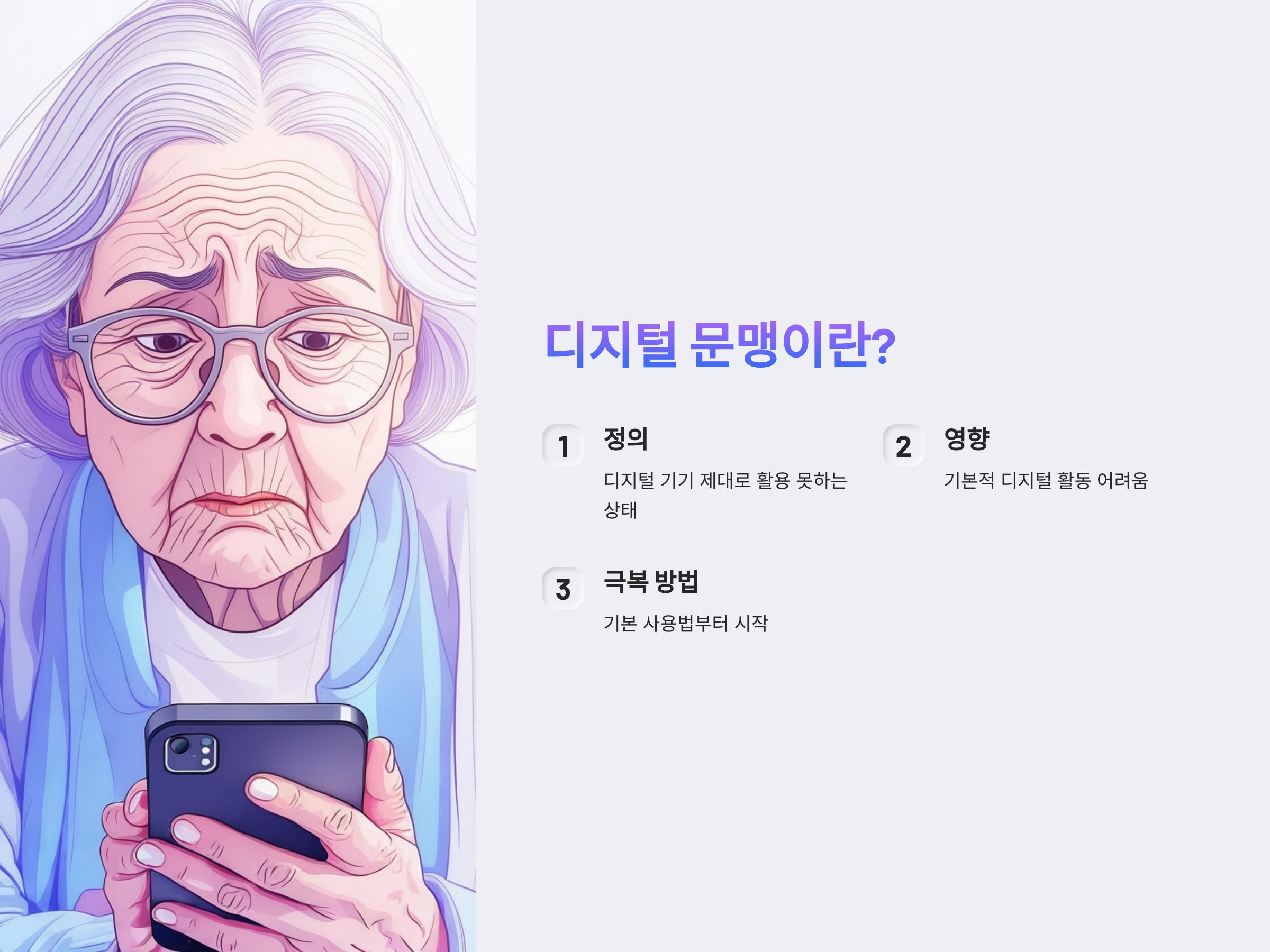 디지털 문맹이란 디지털 기술, 즉 컴퓨터나 스마트폰을 제대로 활용하지 못하는 상태를 의미합니다. 오늘날 디지털 기술은 다양한 분야에서 중요한 역할을 하고 있습니다. 예를 들어, 스마트폰을 통해 대화, 금융 거래, 일정을 관리하거나, 인터넷을 통해 정보를 검색하고 학습할 수 있습니다. 그러나 디지털 문맹 상태에서는 이러한 기본적인 활동을 제대로 하지 못하거나, 심지어 겁을 먹고 회피하는 경향도 있습니다.