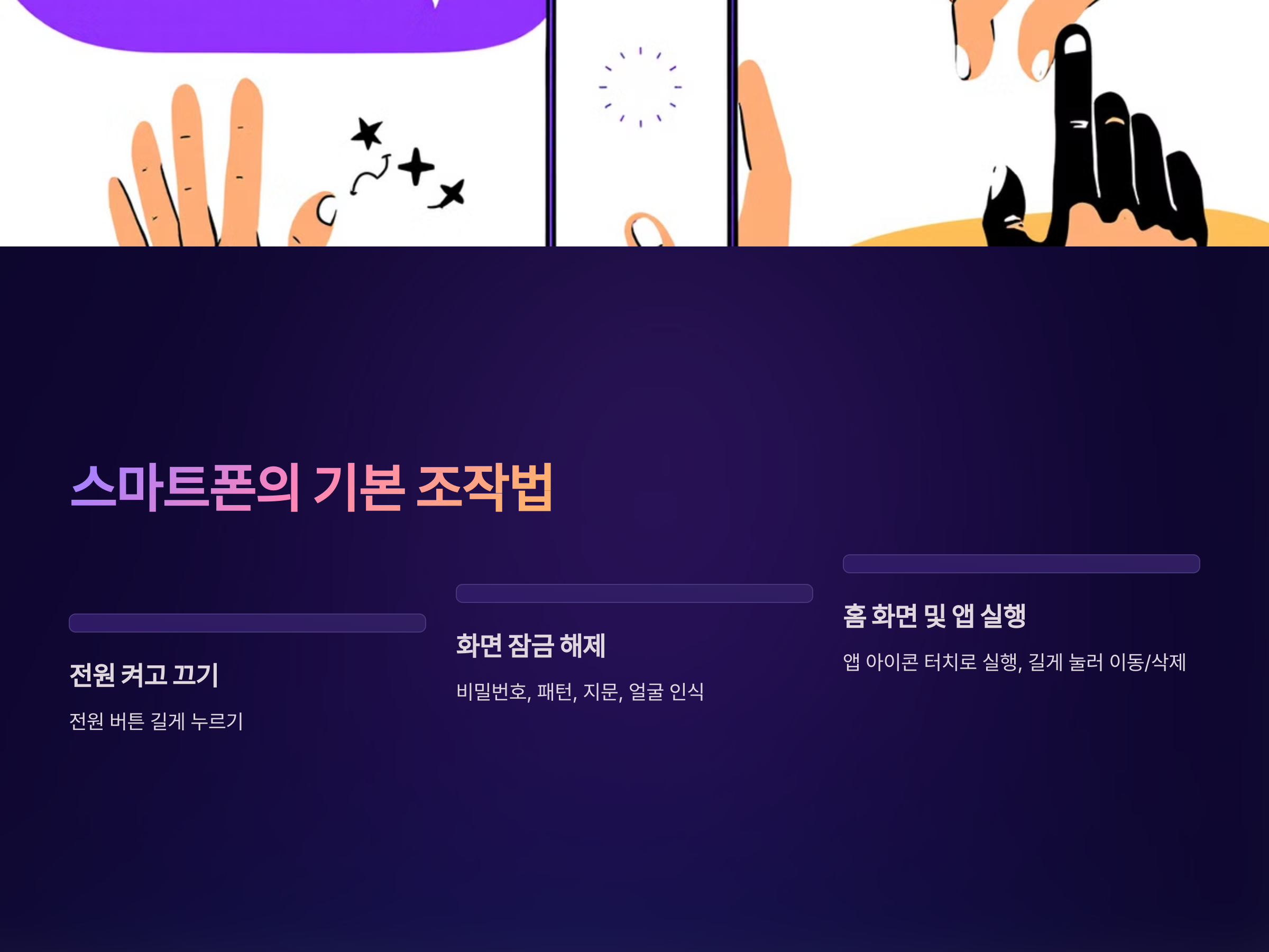 스마트폰을 처음 사용할 때 가장 중요한 것은 기본적인 조작법을 익히는 것입니다. 다음과 같은 핵심 조작법을 알아두면 스마트폰 사용이 훨씬 쉬워집니다.