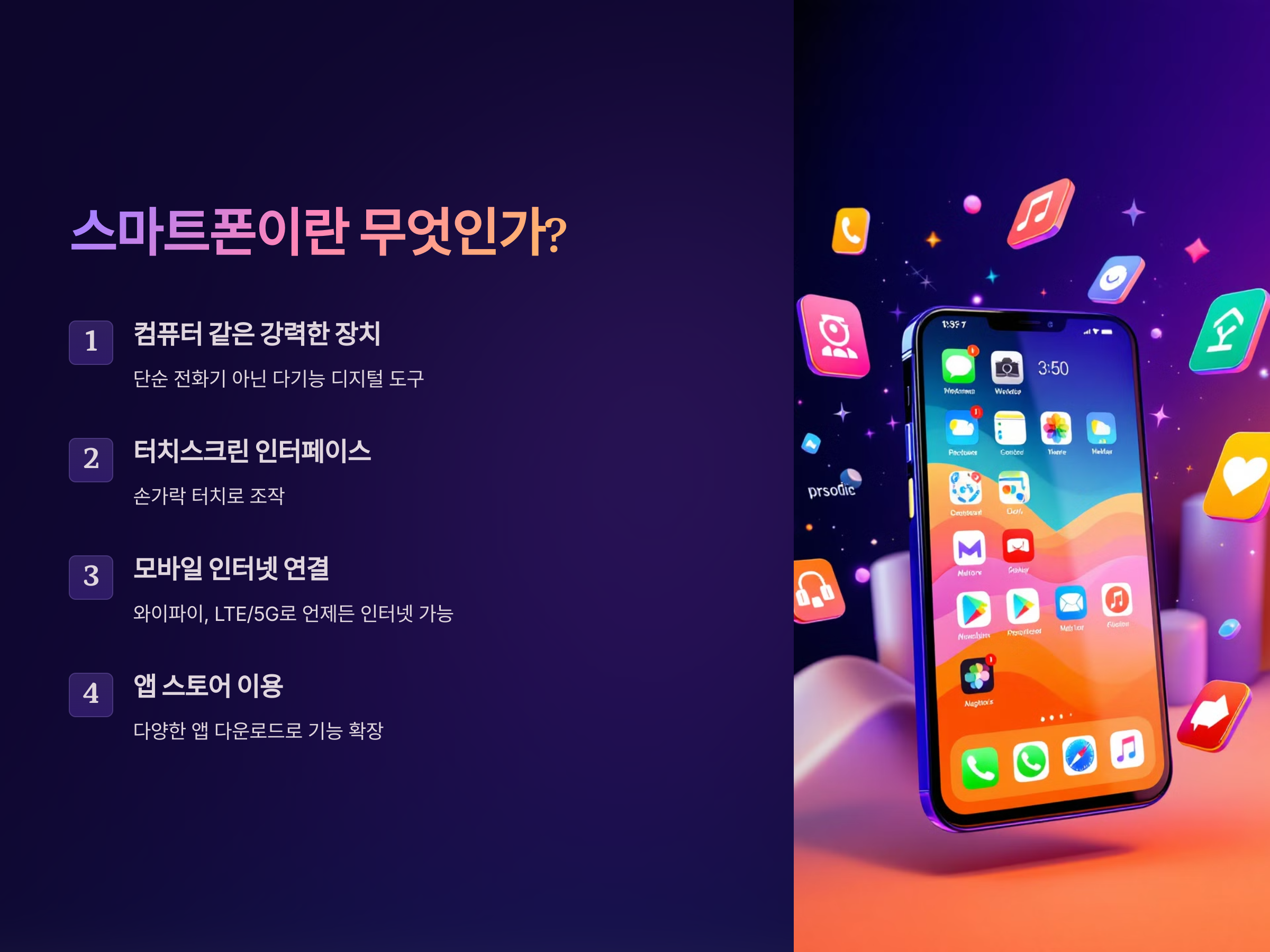 스마트폰은 단순한 전화기가 아니라 컴퓨터와 같은 강력한 기능을 가진 장치입니다. 인터넷 검색, 사진 촬영, 동영상 시청, 문서 작성 등 다양한 작업이 가능하며, 수많은 애플리케이션을 활용하여 생활을 더욱 편리하게 만들 수 있습니다.