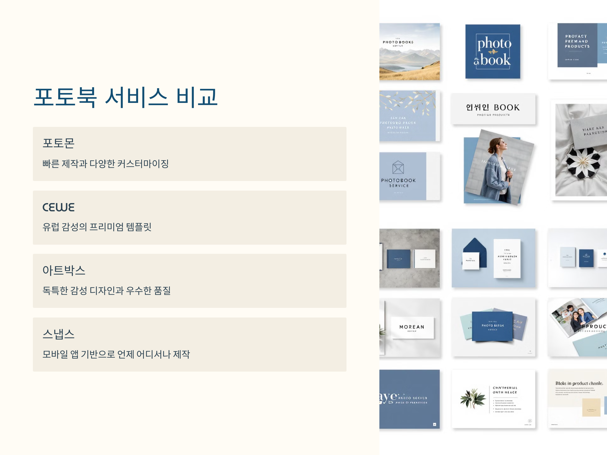예를 들어 포토몬은 빠른 제작과 다양한 커스터마이징이 강점이며, CEWE는 유럽 감성의 프리미엄 템플릿이 인기를 끕니다. 아트박스는 독특한 감성 디자인을 원하는 사람들에게 적합하며, 가격 대비 품질도 우수합니다. 또한 스냅스는 모바일 앱 기반으로 언제 어디서나 쉽게 제작할 수 있어 편리함을 추구하는 이들에게 적합합니다.