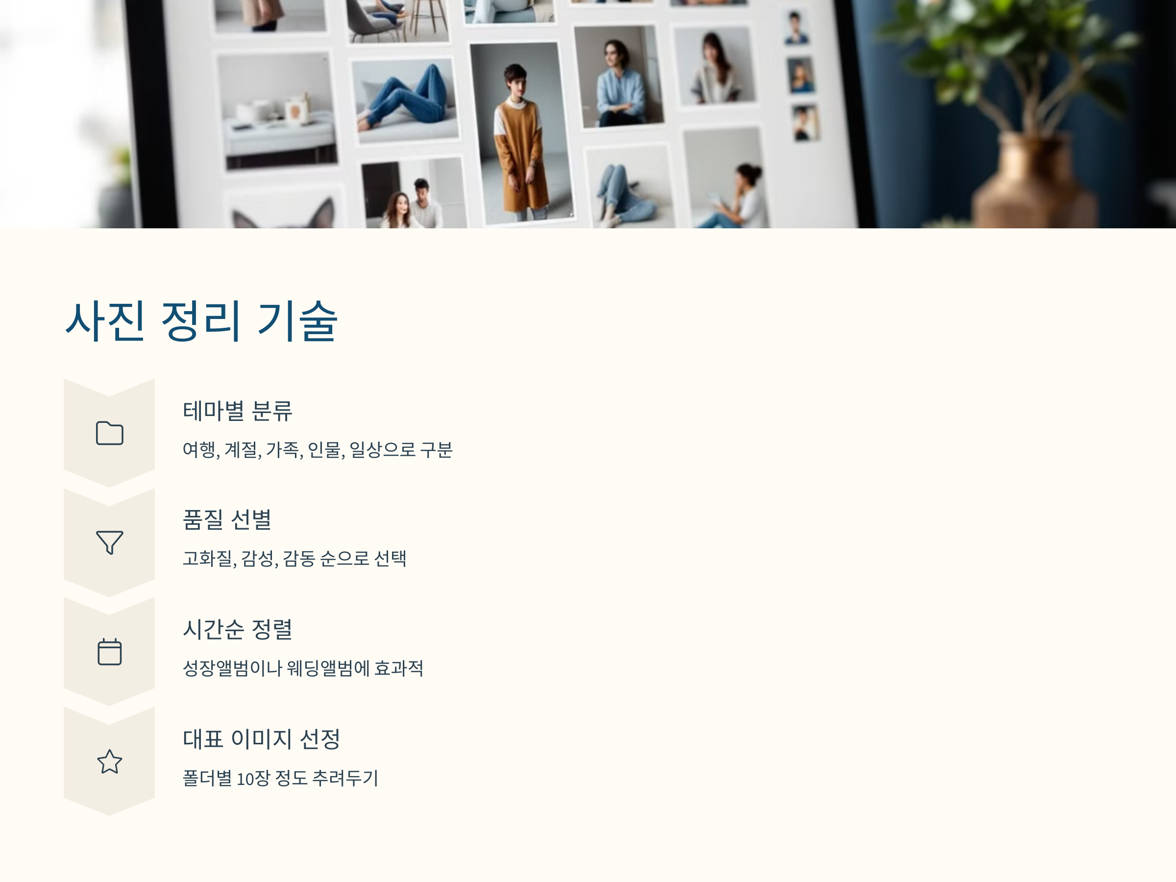 첫째, 테마별로 폴더를 나눕니다. 여행, 계절, 가족, 인물, 일상 등으로 구분하면 전체 구성이 정돈되어 보입니다. 둘째, 고화질 우선, 감성사진 우선, 감동순으로 선별합니다. 셋째, 동일한 구도나 유사한 사진은 하나만 선택합니다. 넷째, 날짜별 정렬도 큰 도움이 됩니다. 특히 성장앨범이나 웨딩앨범의 경우 시간의 흐름을 자연스럽게 보여줄 수 있어 좋습니다.