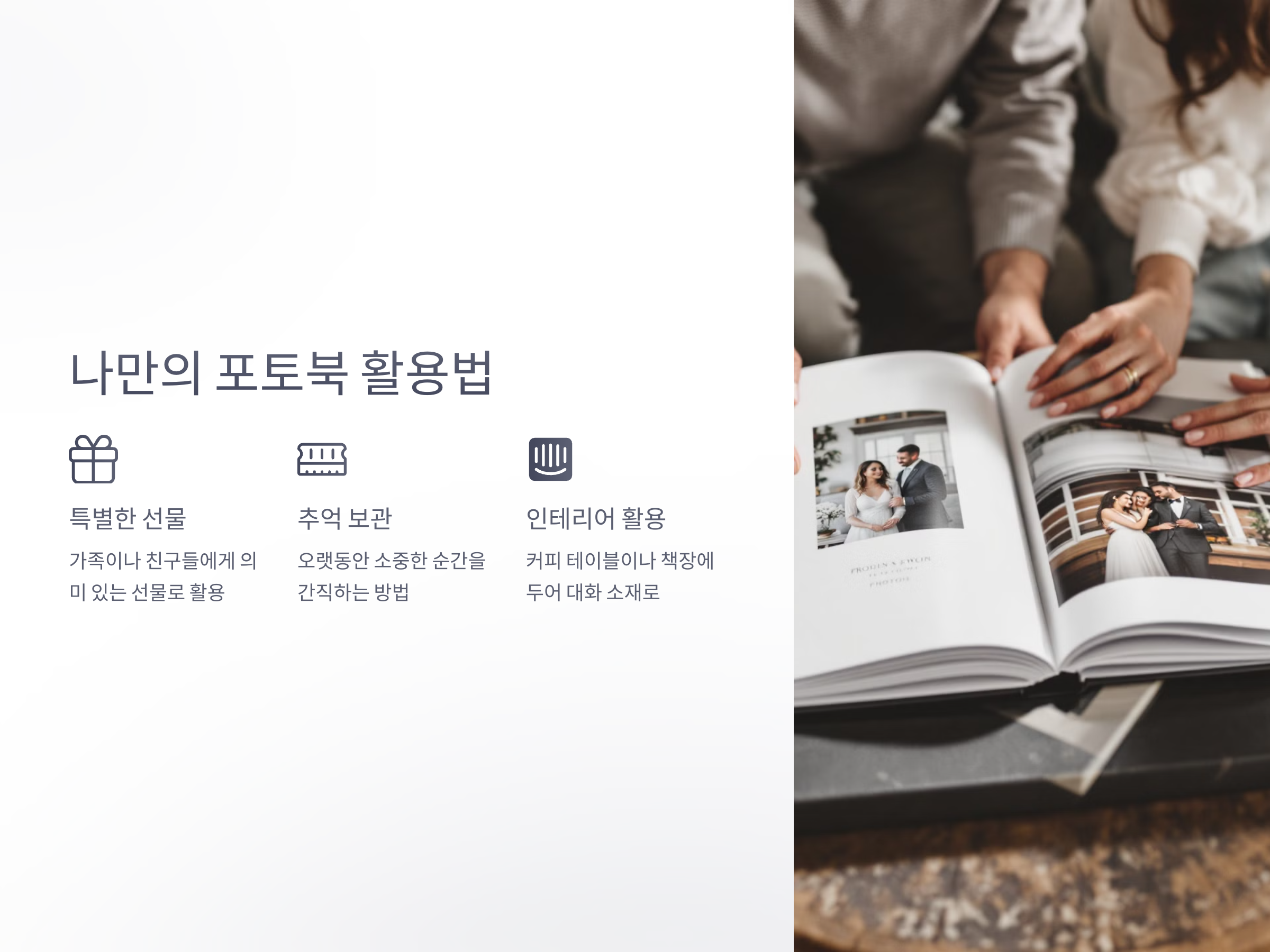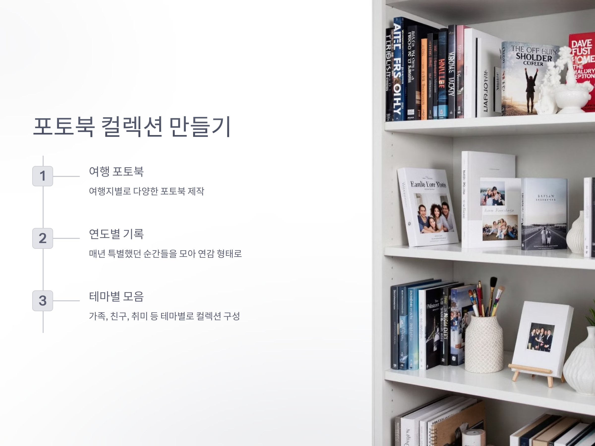 셋째, 포토북은 집안 인테리어에 활용하기도 좋습니다. 고급스러운 디자인의 포토북을 커피 테이블이나 책장에 두면, 손님들이나 가족들과 함께 추억을 나누는 좋은 대화의 소재가 될 수 있습니다. 또한, 포토북을 꾸준히 제작하고 기록해나가면, 시간이 지나면서 나만의 포토북 컬렉션이 쌓이게 되어 추억을 더욱 풍성하게 만들 수 있습니다.