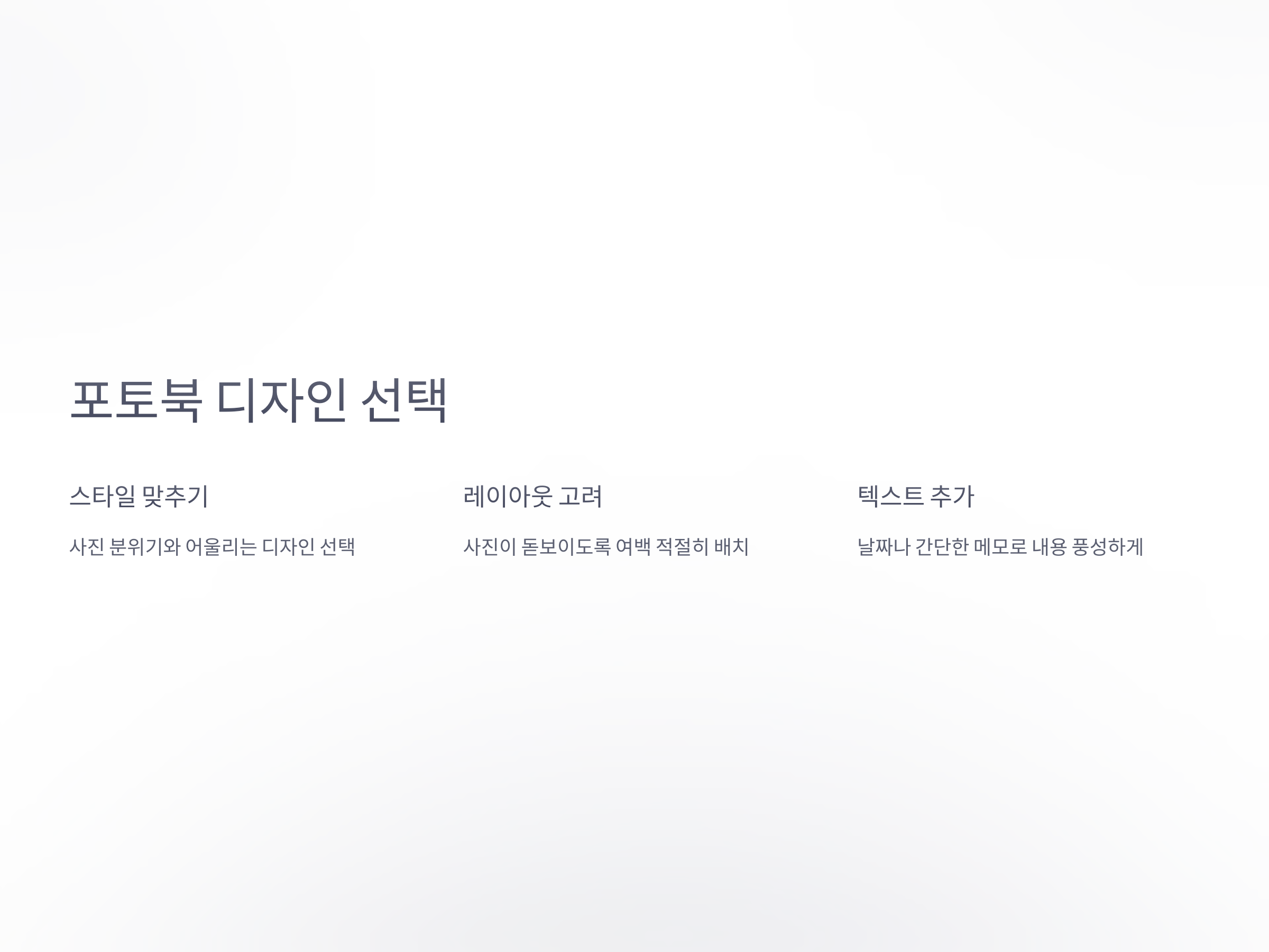 포토북의 레이아웃도 중요한 요소입니다. 각 페이지마다 몇 장의 사진을 배치할지, 사진의 크기와 배치를 어떻게 할지 등을 결정해야 합니다. 이 때, 디자인을 과하게 채우기보다는 각 사진이 돋보일 수 있도록 여백을 적절히 두는 것이 더 고급스럽고 깔끔한 느낌을 줍니다. 또한 사진에 텍스트를 추가할 수 있는 옵션도 있으니, 필요한 경우 날짜나 간단한 메모를 추가하여 더 풍성한 내용을 담을 수 있습니다.