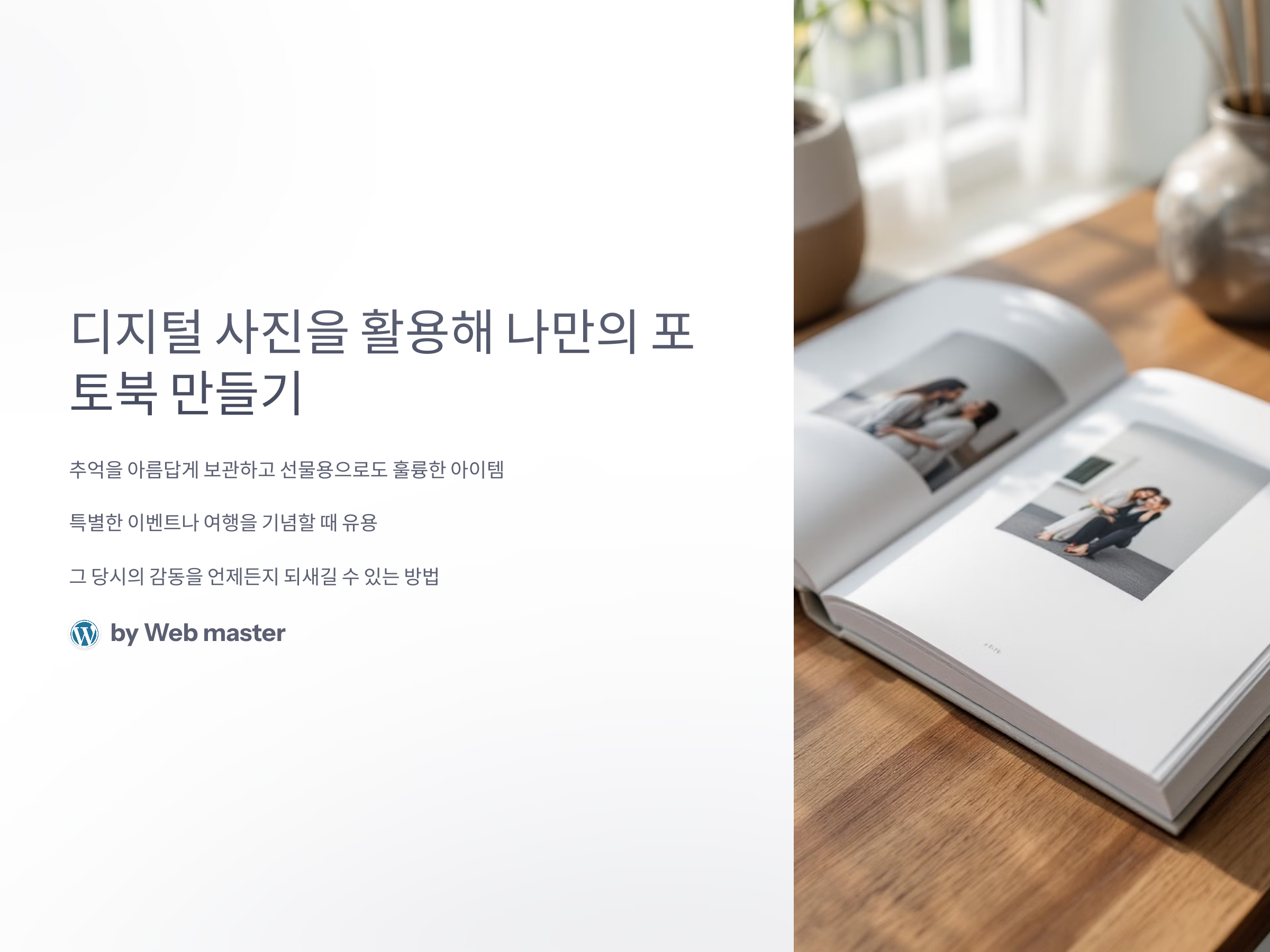디지털 사진을 활용해 나만의 포토북을 만드는 과정은 창의력과 감성이 결합된 즐거운 작업입니다. 사진 선택부터 디자인, 편집까지 자신만의 스타일로 꾸며가는 과정은 그 자체로 큰 의미를 갖습니다. 포토북은 소중한 기억을 기록으로 남길 수 있는 훌륭한 방법이며, 완성된 포토북은 특별한 의미를 더해주기 때문에 매우 보람찬 작업이 될 것입니다.