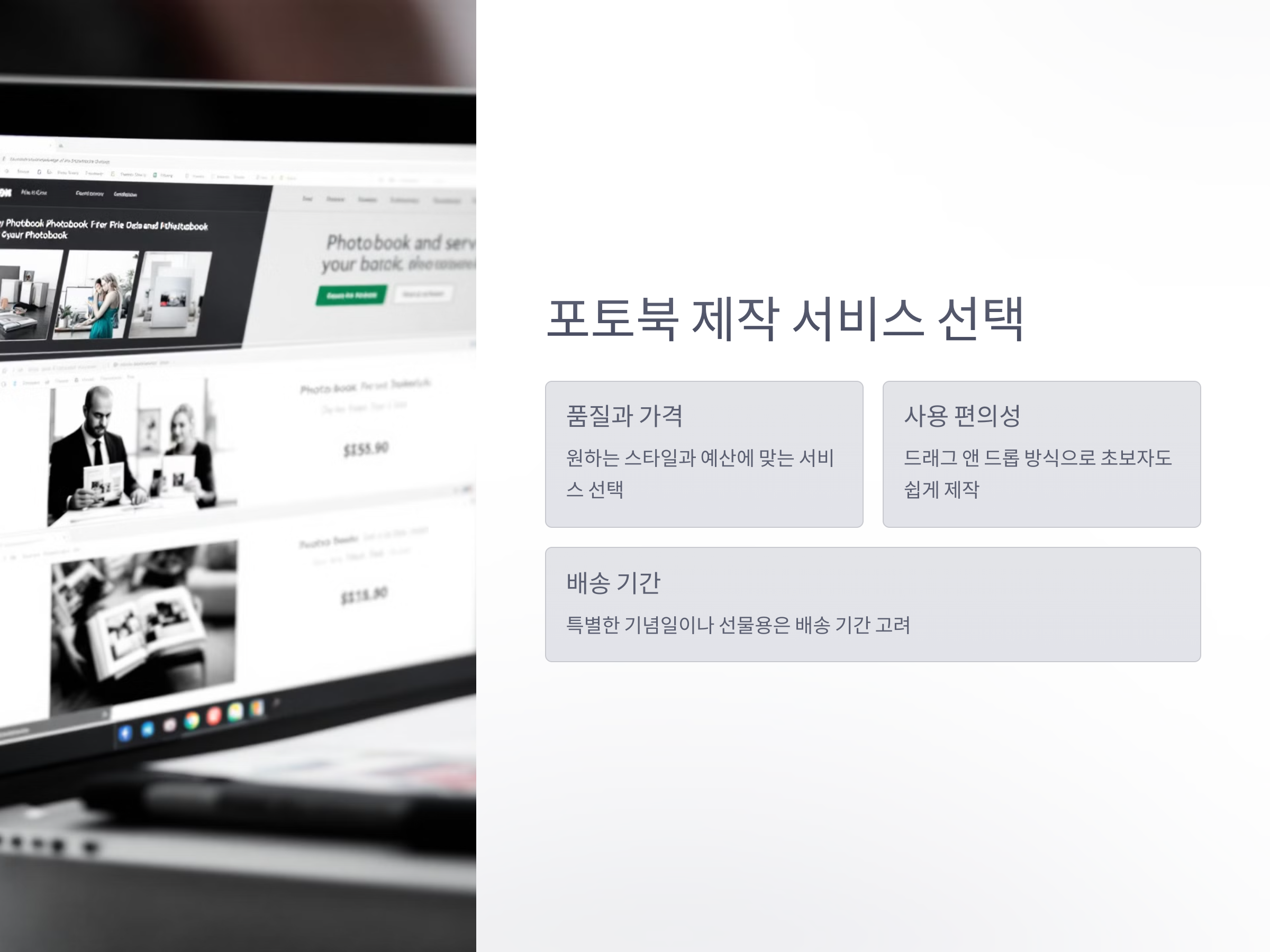 포토북을 제작할 때는 다양한 포토북 제작 서비스를 이용할 수 있습니다. 온라인 포토북 제작 플랫폼들은 각기 다른 가격대와 품질, 디자인 옵션을 제공하므로, 원하는 스타일과 예산에 맞는 서비스를 선택하는 것이 중요합니다. 많은 서비스에서는 간편한 드래그 앤 드롭 방식으로 사진을 넣고 편집할 수 있어 초보자도 쉽게 포토북을 만들 수 있습니다.