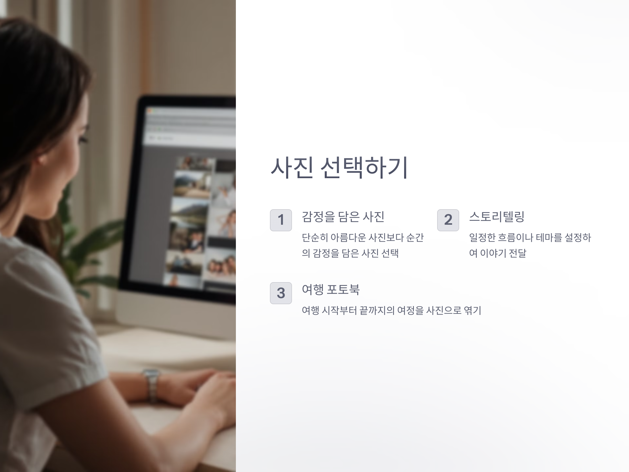 포토북을 만들기 위한 첫 번째 단계는 무엇보다도 "사진 선택"입니다. 수많은 디지털 사진들 중에서 포토북에 담을 사진을 선택하는 일이 가장 중요한 작업입니다. 사진을 선택할 때는 단순히 아름다운 사진만 고르는 것이 아니라, 그 순간의 감정을 담을 수 있는 사진을 고르는 것이 중요합니다. 예를 들어, 여행지에서 찍은 사진 중 기억에 남는 순간을 담은 사진이나 가족의 중요한 기념일에 찍은 사진을 중심으로 선택하는 것이 좋습니다.