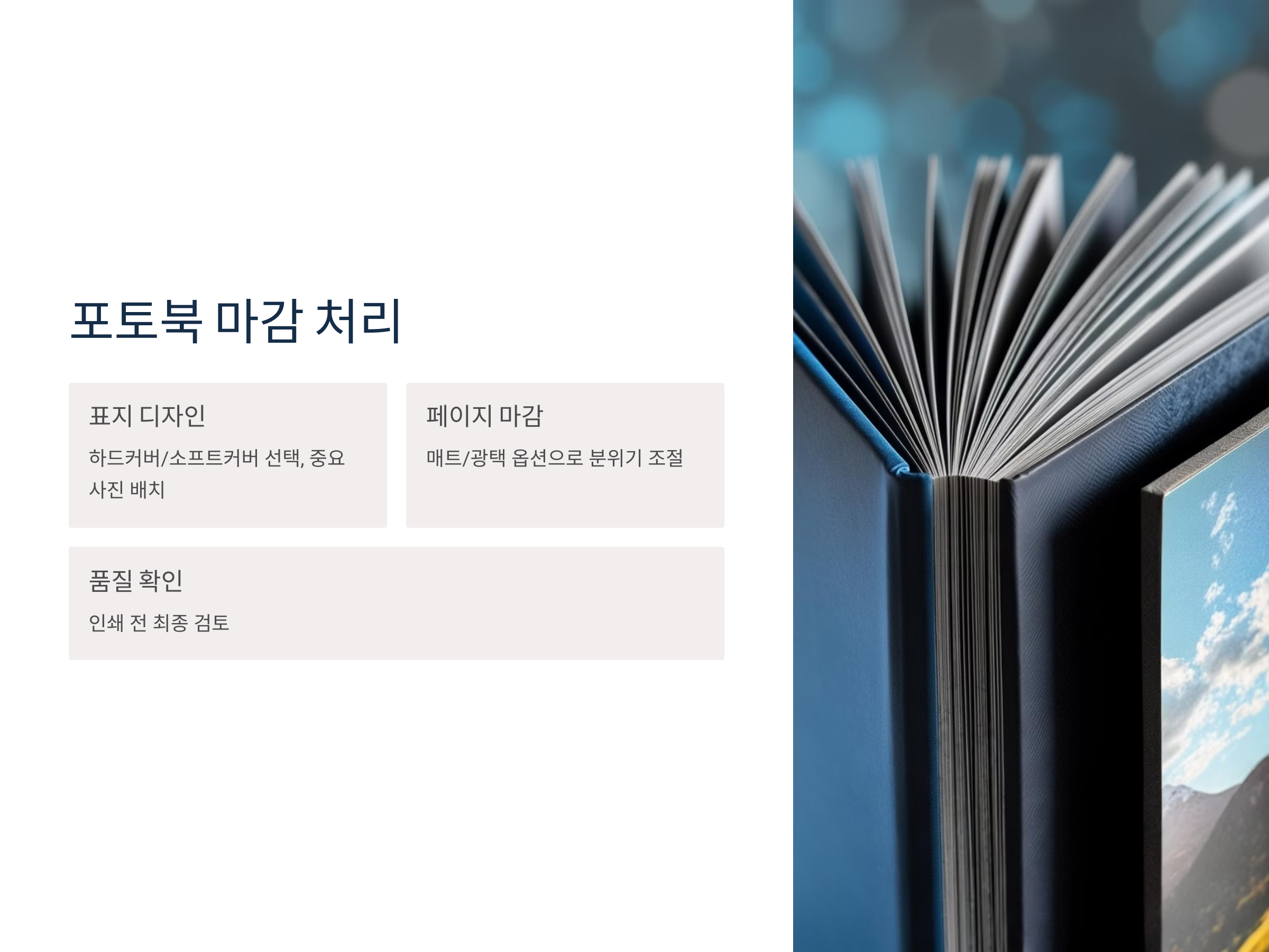 포토북을 완성하고 나면, 마감 처리가 중요한 역할을 합니다. 마감 처리란, 포토북의 표지나 페이지에 대한 마감 방식으로, 더욱 고급스러운 느낌을 줍니다.