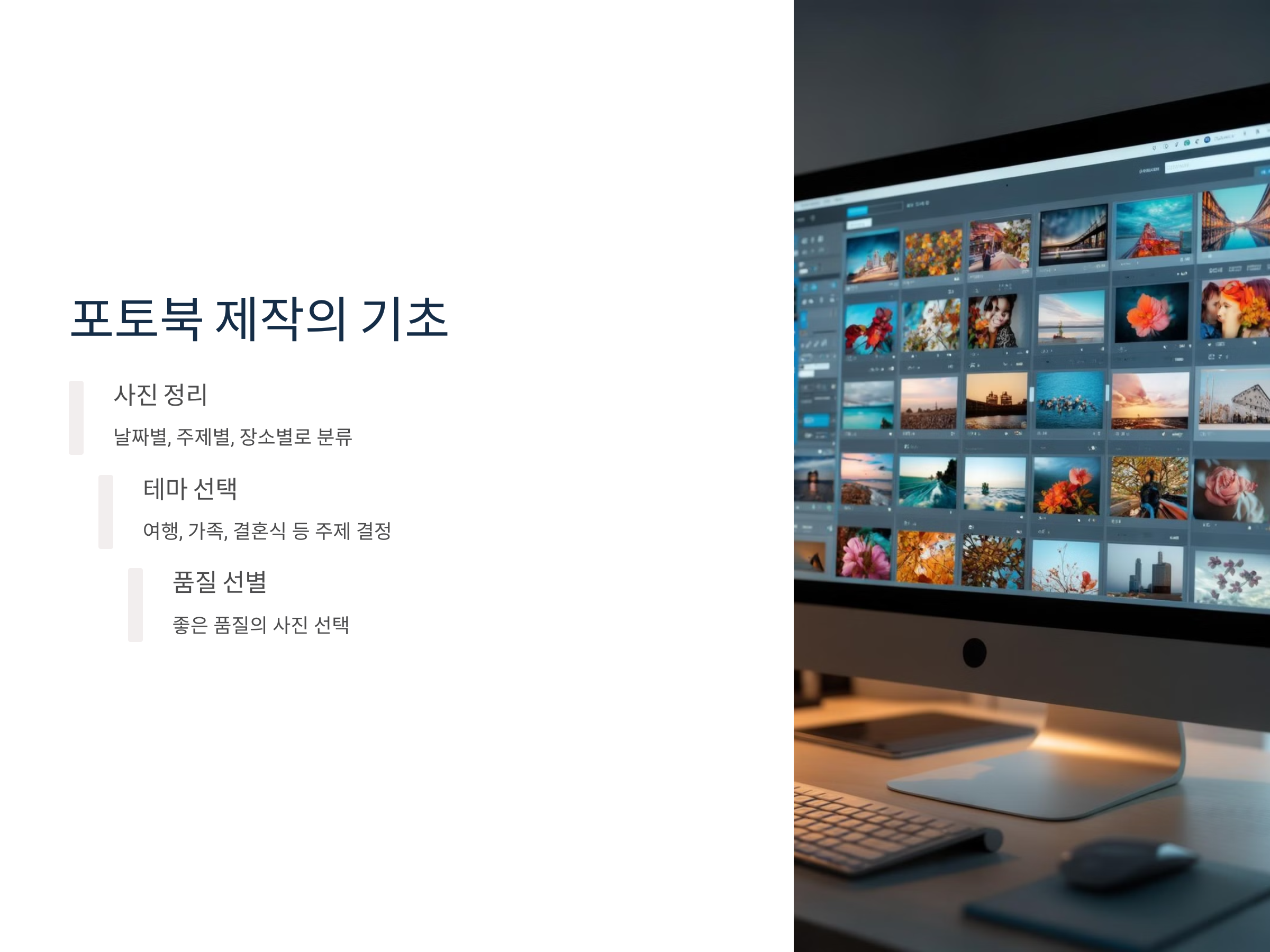 포토북 제작을 시작하기 전에, 사진들을 날짜별, 주제별 또는 장소별로 정리해보세요. 예를 들어, 여행 포토북을 만든다면, 여행지와 날짜에 맞춰 사진들을 나누고, 어떤 사진을 어떤 페이지에 배치할지 생각해보는 것이 중요합니다. 이런 정리가 끝난 후에는 좋은 품질의 사진을 선택하는 것이 중요합니다.