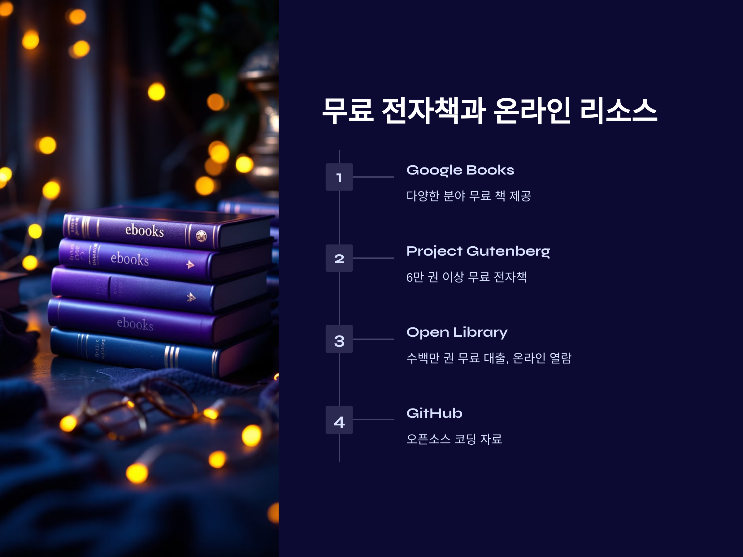 학습에 있어 강의만큼 중요한 것이 바로 참고 자료입니다. 많은 사이트에서는 강의와 함께 무료로 제공되는 전자책이나 학습 자료도 제공합니다. 예를 들어 Google Books, Project Gutenberg, Open Library와 같은 웹사이트에서는 수많은 무료 전자책을 찾을 수 있습니다. 또한 GitHub에서는 오픈소스로 공개된 다양한 코딩 관련 자료나 학습 자료들을 무료로 활용할 수 있습니다.