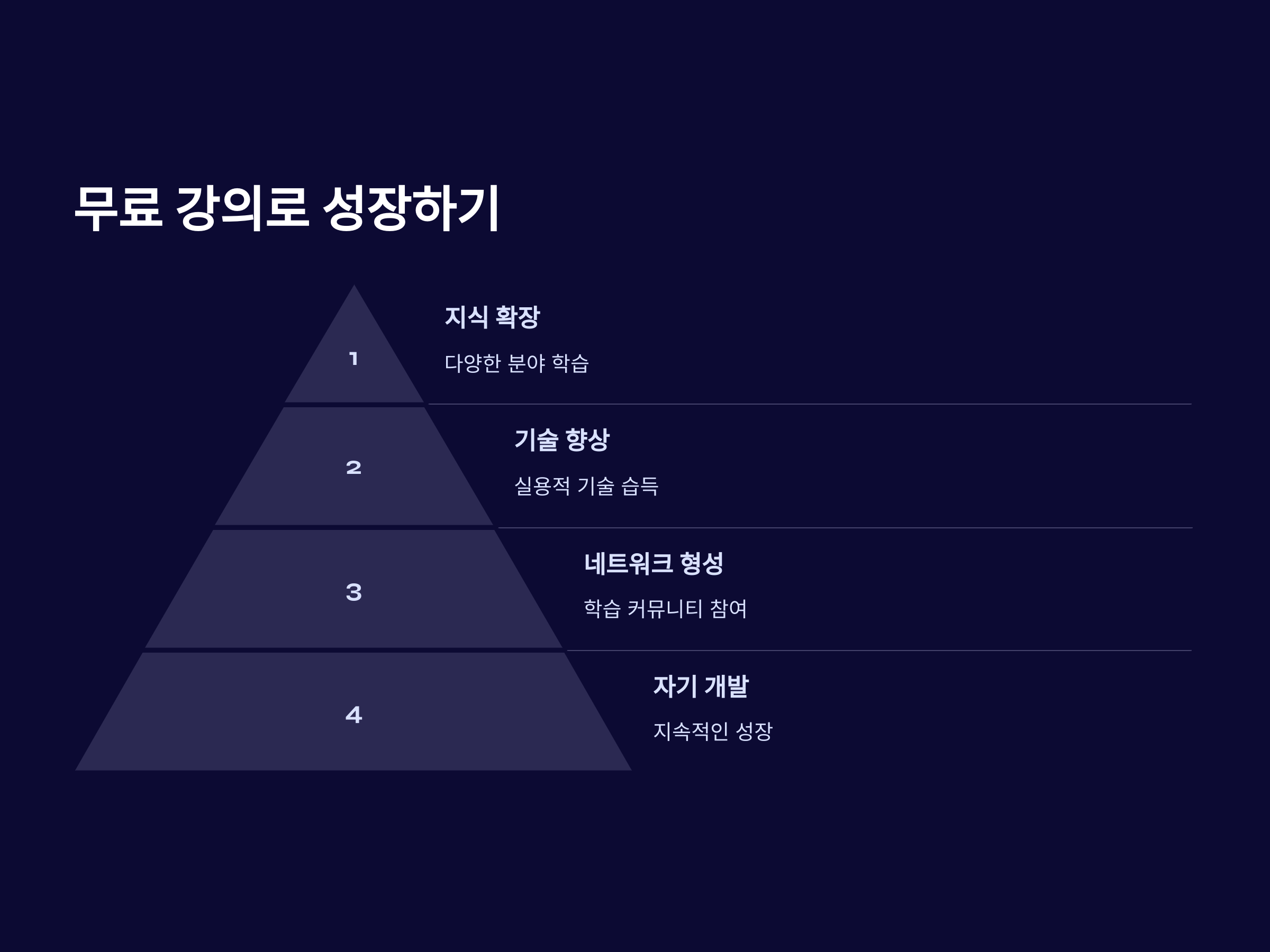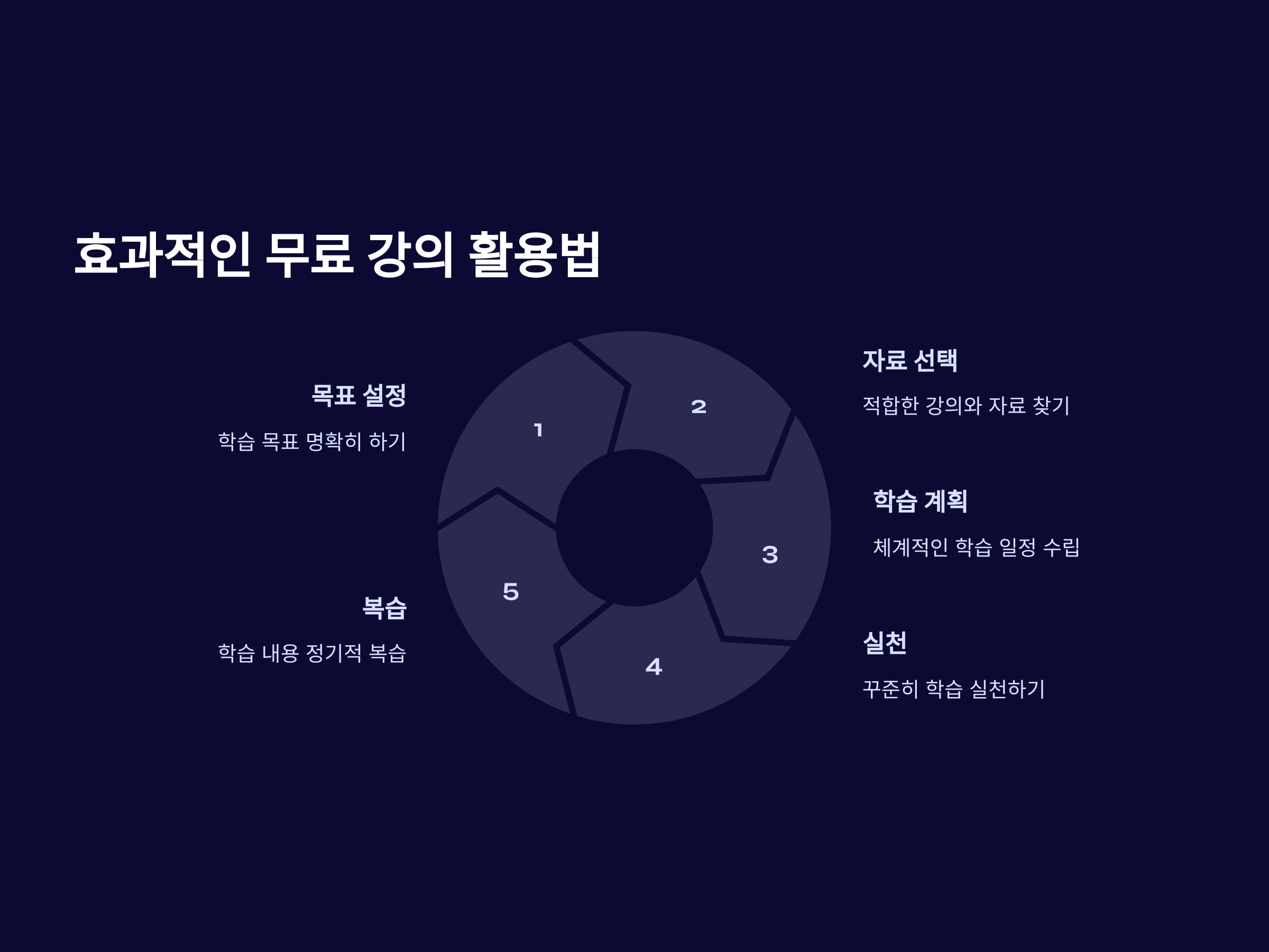 무료 강의를 통해 공부하는 방법은 매우 다양하고 접근하기 쉽습니다. 각종 무료 강의 플랫폼, 검색 사이트, 전자책, 커뮤니티와 세미나까지 모두 손쉽게 활용할 수 있는 자원입니다. 이를 잘 활용하면 언제 어디서나 원하는 분야의 학습을 할 수 있고, 또한 실력을 향상시킬 수 있습니다. 중요한 점은 자신이 무엇을 배우고 싶은지 명확히 하고, 그에 맞는 자료를 체계적으로 찾아서 공부하는 것입니다.