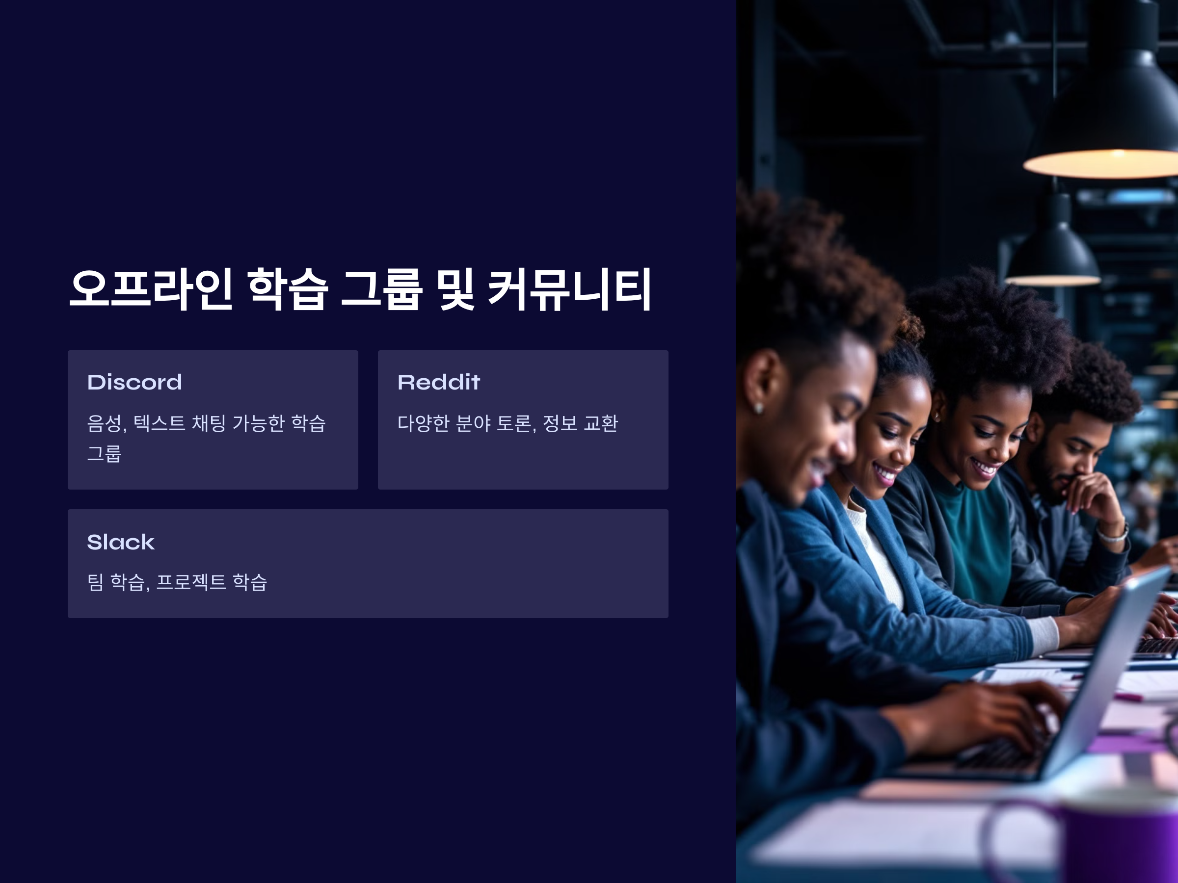 온라인 강의를 듣고 혼자 공부하는 것이 어렵다면, 오프라인 학습 그룹이나 커뮤니티를 활용하는 것도 좋은 방법입니다. 온라인 강의나 자료를 기반으로 공부하는 사람들끼리 모여 서로 학습을 도울 수 있습니다. 예를 들어 Discord, Reddit의 서브레딧, Slack 등의 커뮤니티를 통해 다양한 학습 자료를 공유하거나 공부할 수 있습니다.