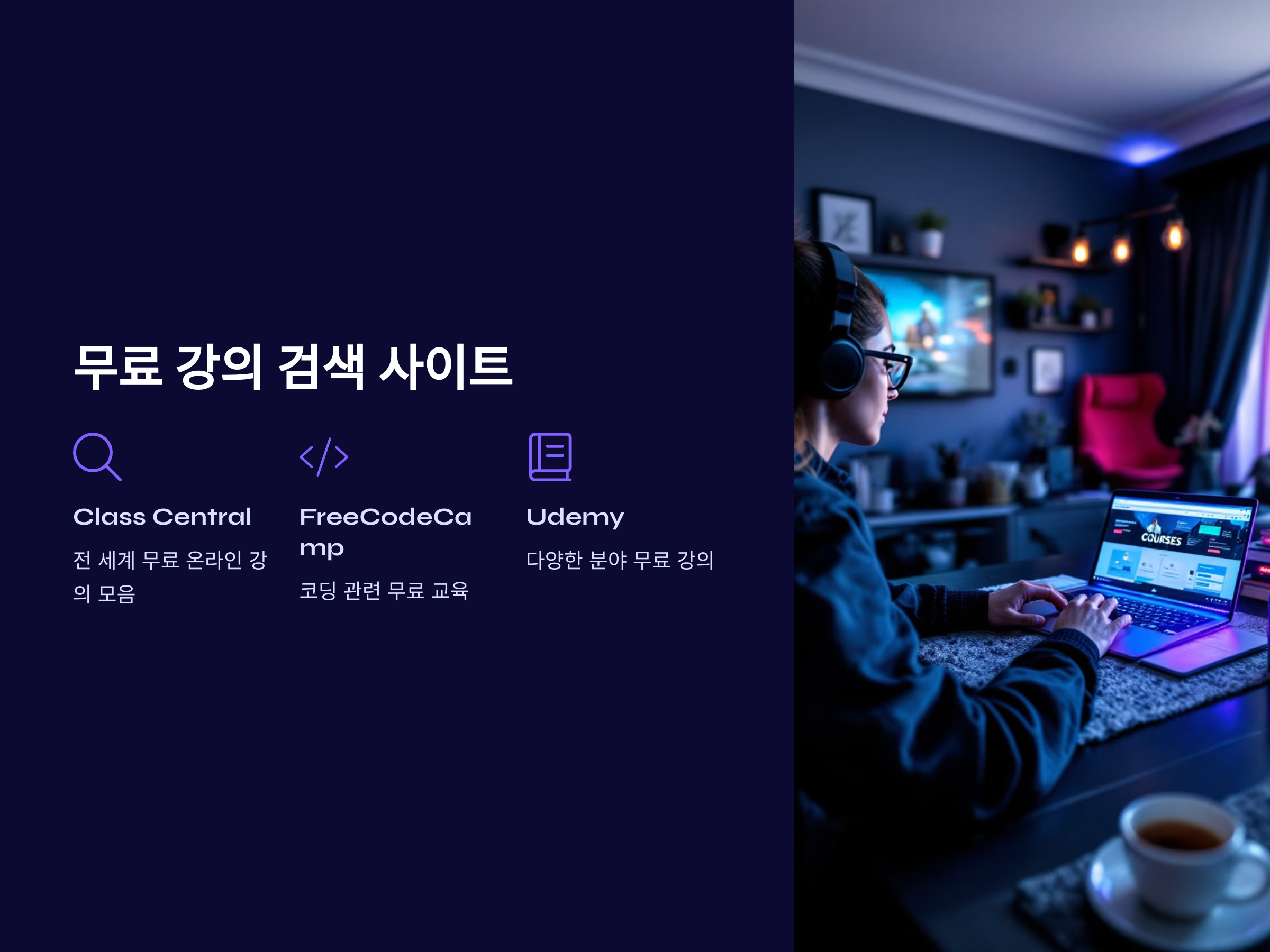 각각의 플랫폼 외에도 무료 강의를 전문적으로 모아놓은 웹사이트들이 존재합니다. 이러한 사이트들은 다양한 무료 강의를 한 곳에서 손쉽게 찾아볼 수 있게 도와줍니다. 대표적인 무료 강의 검색 사이트로는 Class Central, FreeCodeCamp, Udemy 등이 있습니다.