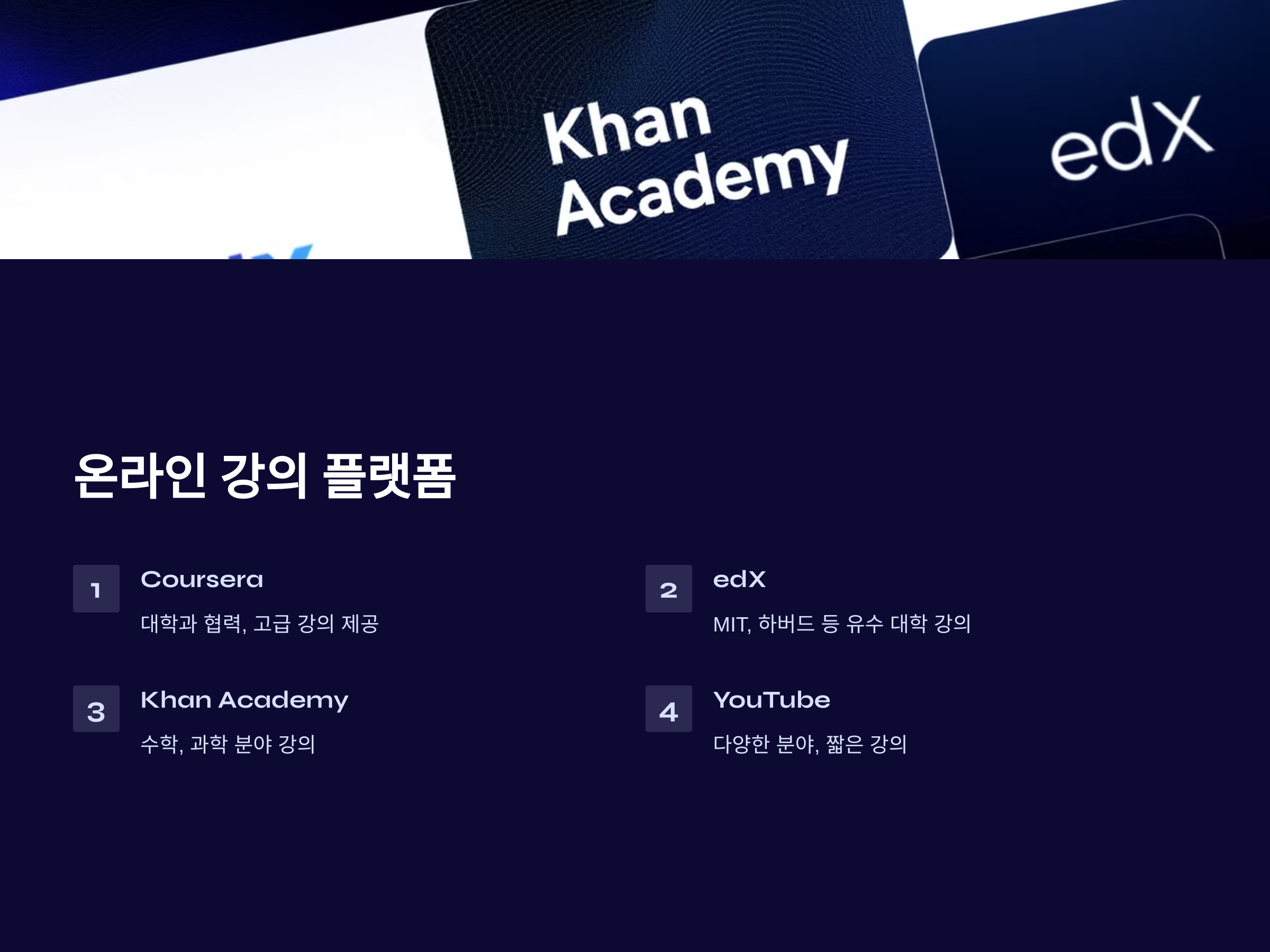 - Coursera는 많은 대학과 협력하여 고급 강의를 제공하는 플랫폼으로, 무료 강의도 상당히 많이 제공됩니다.