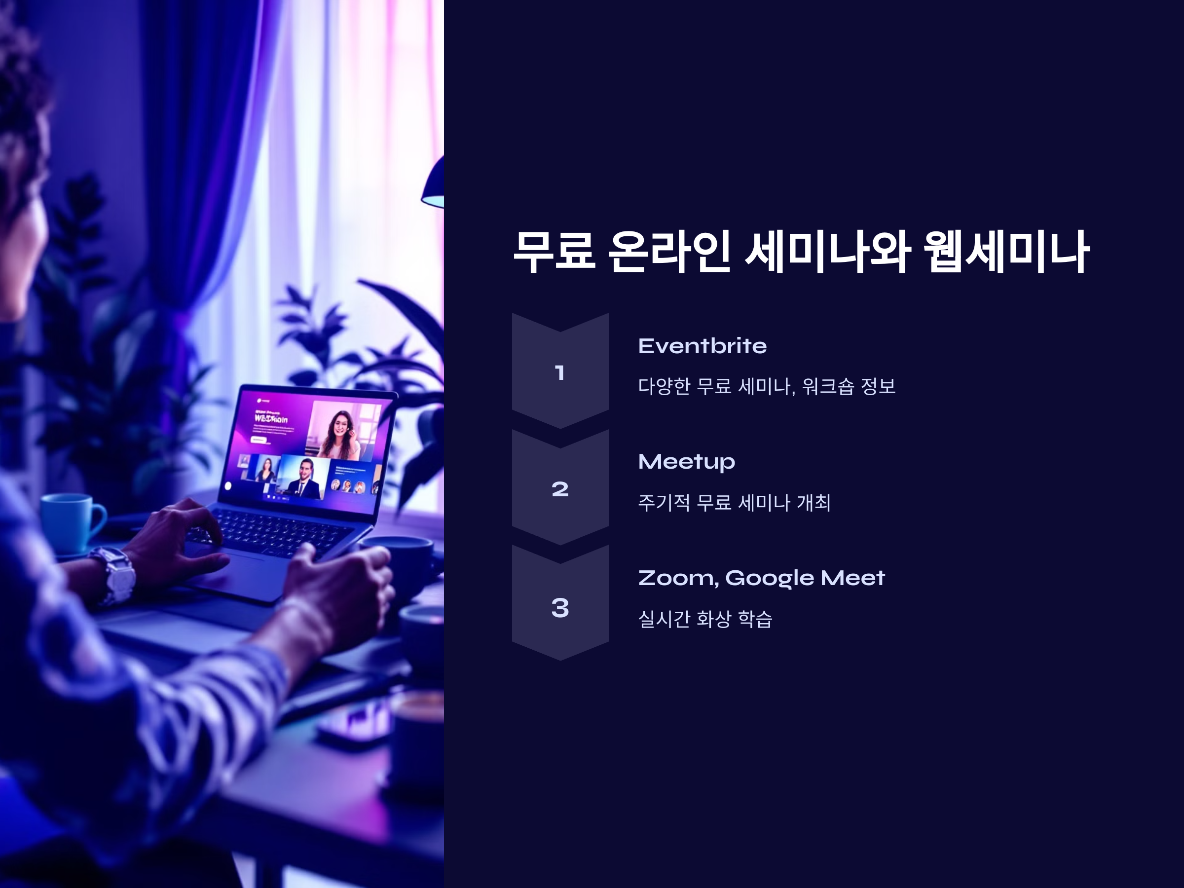 인터넷을 통해 실시간으로 진행되는 웹세미나(Webinar)나 온라인 세미나도 유용한 학습 자원이 될 수 있습니다. 많은 기업과 기관들이 특정 주제에 대해 전문가들이 강의를 진행하며, 이를 무료로 제공하는 경우가 많습니다. 세미나에 참여하면 최신 트렌드와 정보를 얻을 수 있으며, 질의응답을 통해 깊이 있는 지식을 얻을 수 있습니다.