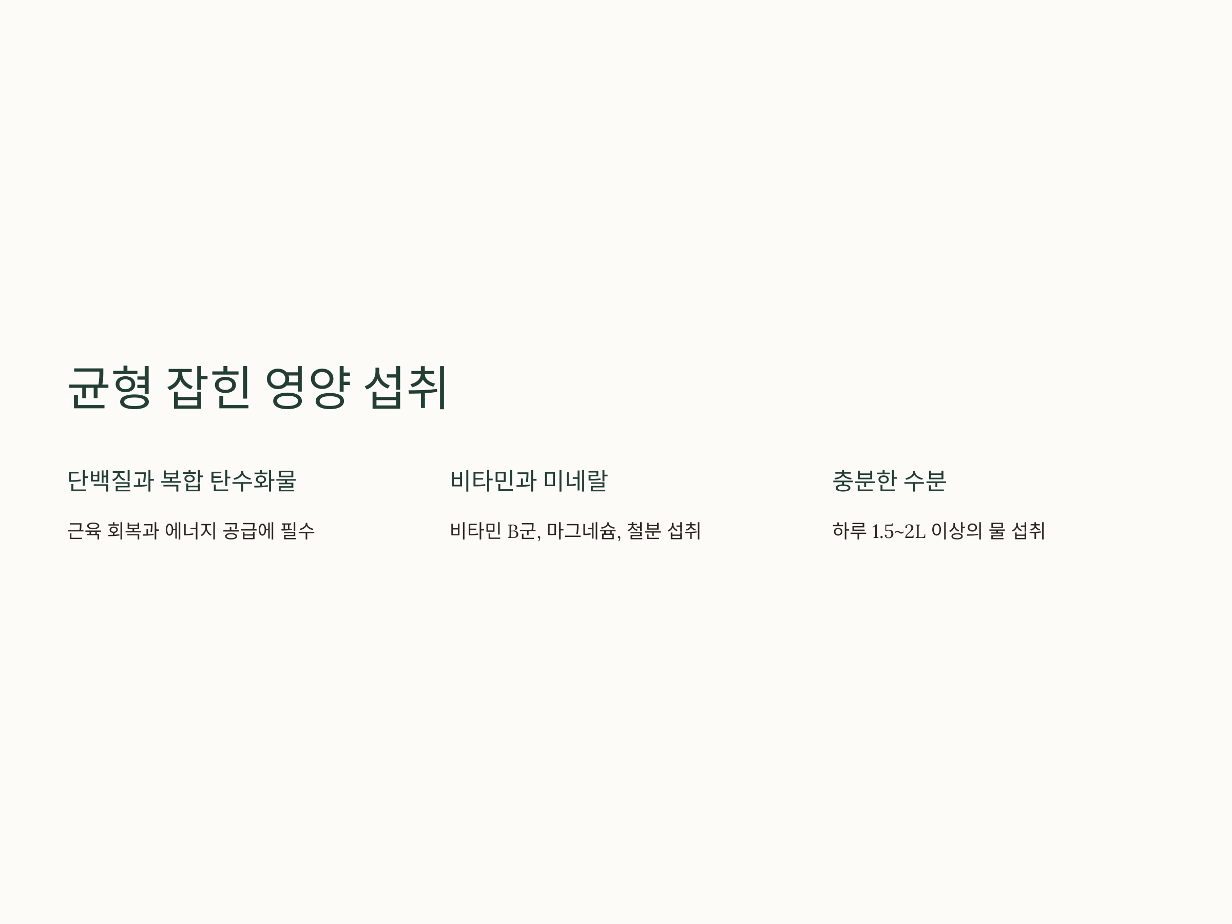 - 단백질과 복합 탄수화물 섭취: 근육 회복과 에너지 공급을 위해 단백질과 복합 탄수화물을 균형 있게 섭취해야 합니다.