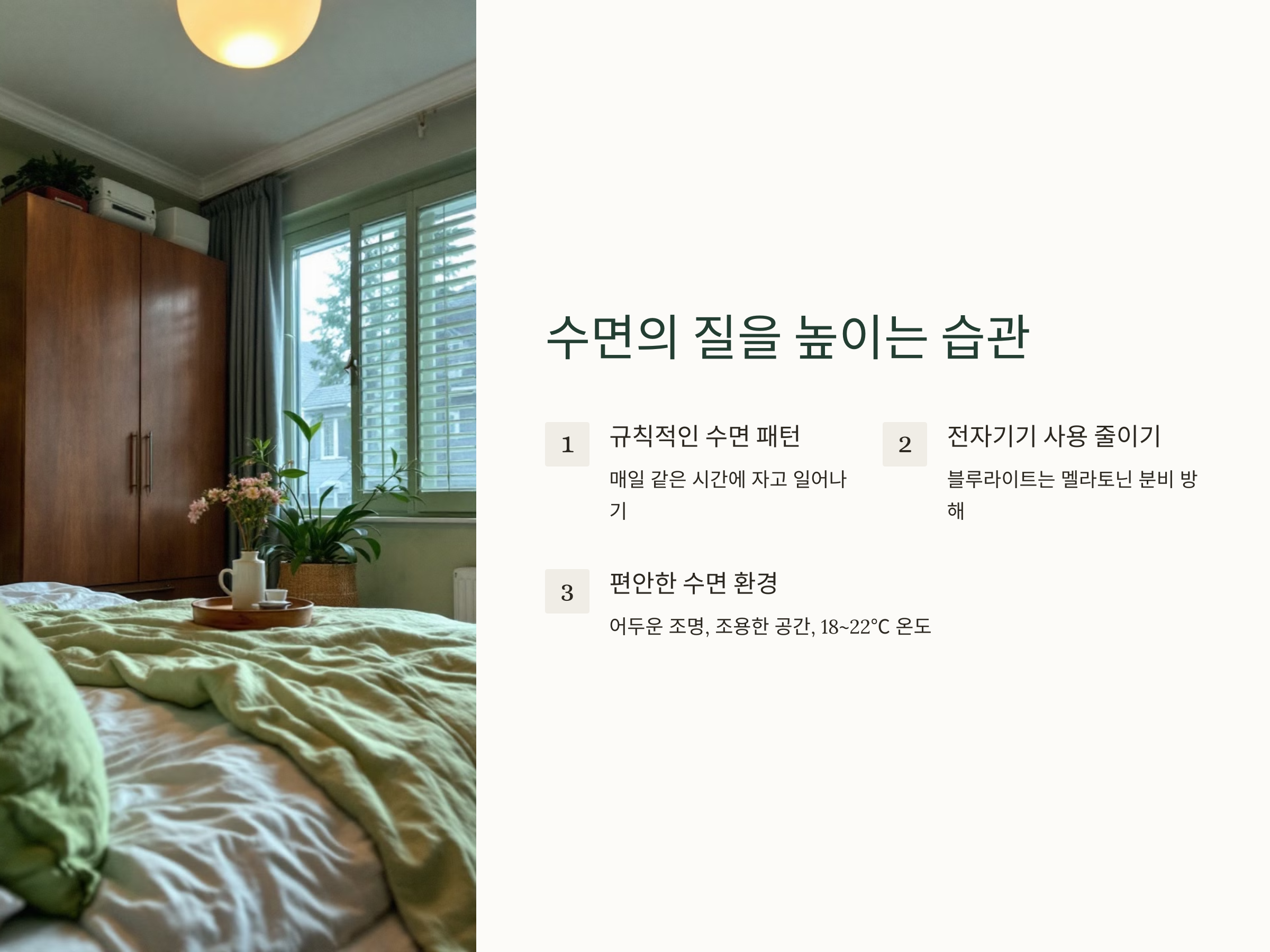 - 편안한 수면 환경 조성: 어두운 조명, 조용한 공간, 적절한 실내 온도(18~22℃)를 유지하면 깊은 잠에 들기 쉬워집니다.