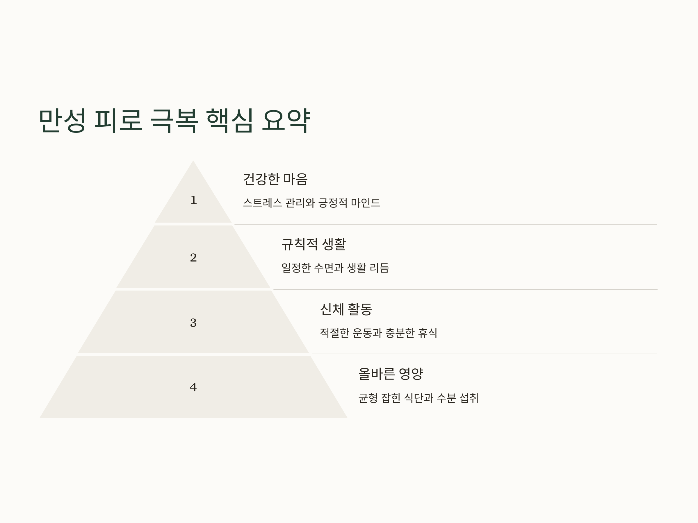 - 근력 운동 병행: 근육을 단련하면 신체 에너지 소비 효율이 증가하여 피로감을 줄이는 데 도움이 됩니다.