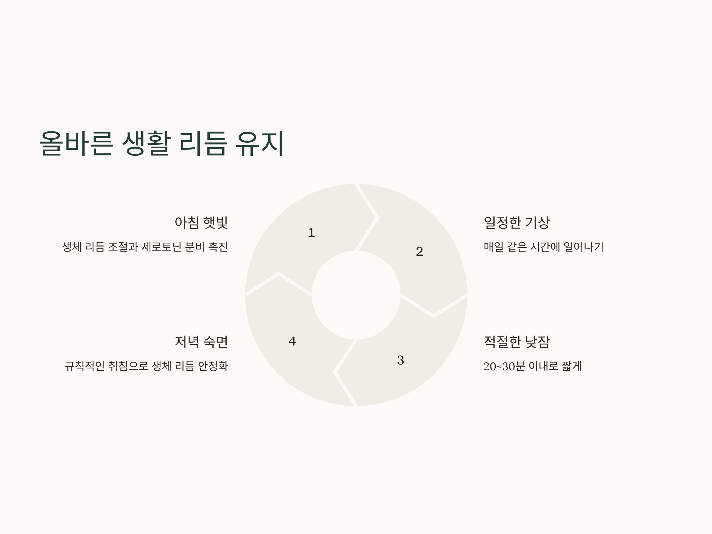 - 낮잠을 피하고 저녁에 숙면 유도: 낮잠은 20~30분 이내로 짧게 자야 밤에 숙면을 취할 수 있습니다.