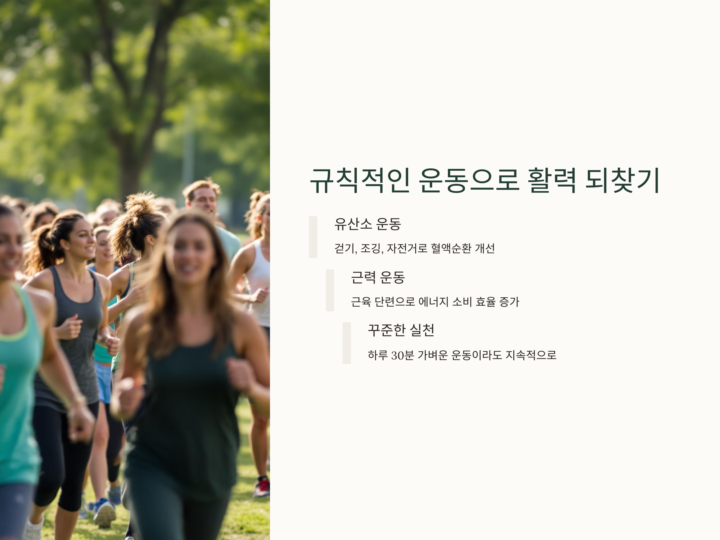 운동은 피로를 줄이고 신체 에너지를 증가시키는 가장 효과적인 방법 중 하나입니다. 하지만 과도한 운동은 오히려 피로를 가중시킬 수 있으므로 적절한 강도로 조절하는 것이 중요합니다.