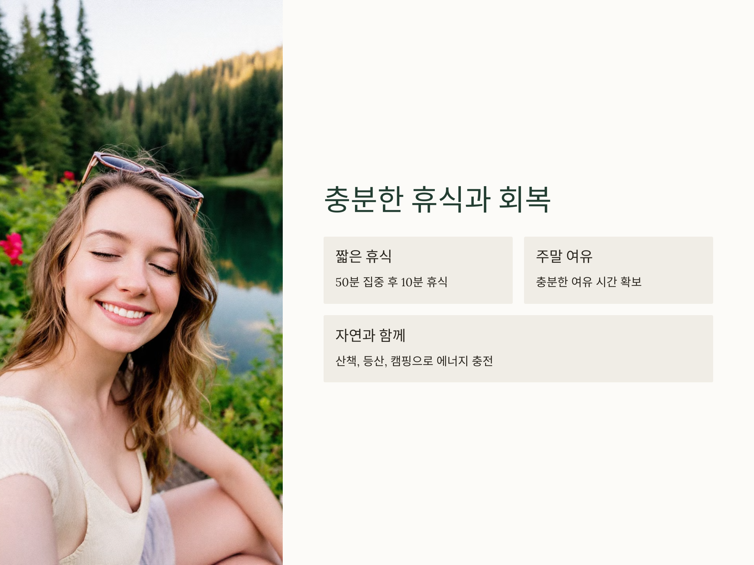 - 짧은 휴식 시간 가지기: 50분 집중 후 10분 휴식을 취하면 업무 효율과 피로 회복에 도움이 됩니다.