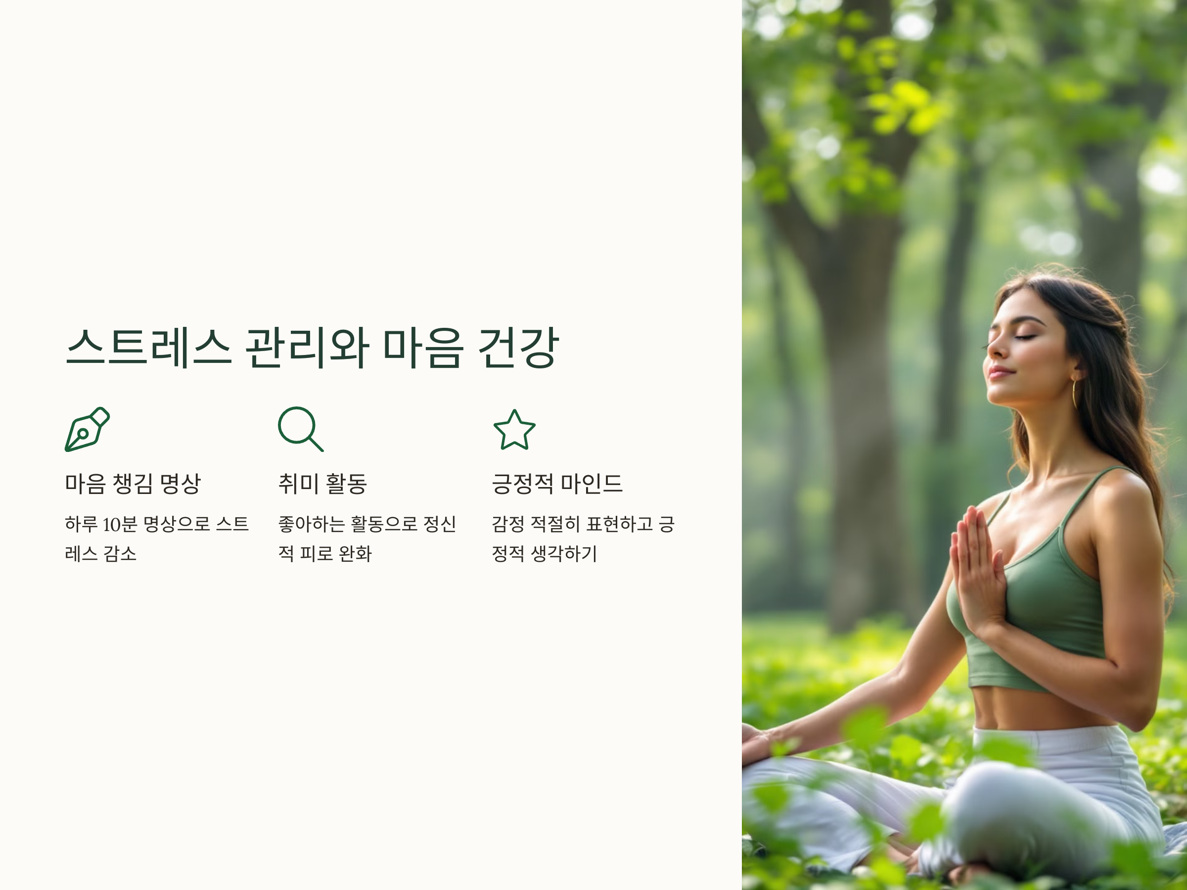 - 마음 챙김 명상 실천: 하루 10분만 명상을 해도 스트레스를 줄이고 집중력을 향상시킬 수 있습니다.