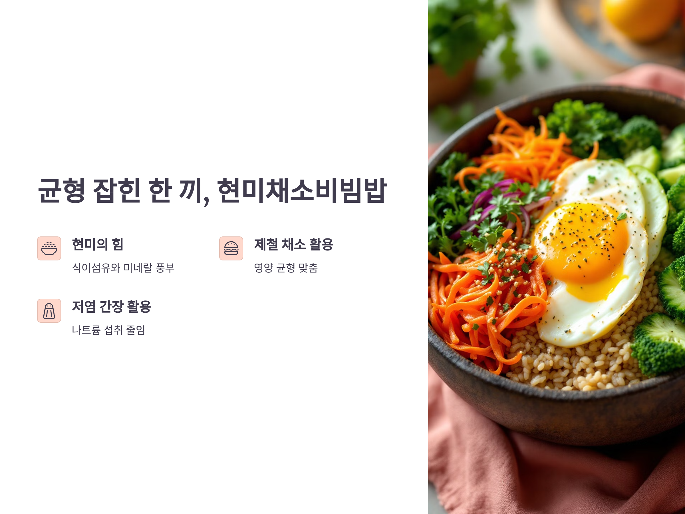 기본 재료로는 현미밥, 시금치, 당근, 애호박, 콩나물, 달걀 등을 사용하며, 고추장 대신 저염 간장이나 된장을 활용하면 나트륨 섭취를 줄일 수 있습니다. 기름 대신 참기름 한 스푼과 깨소금으로 풍미를 더하면 건강함과 맛을 모두 잡을 수 있습니다.