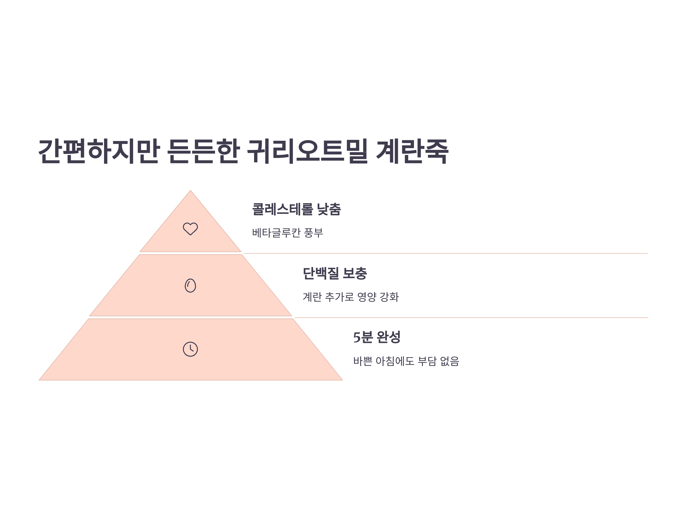 귀리 오트밀 1/2컵과 물 1컵, 달걀 1개, 소금 약간만 있으면 되고, 기호에 따라 브로콜리나 당근을 다져 넣으면 더욱 좋습니다. 전자레인지나 냄비에서 5분 이내로 완성되며, 속이 편안하고 포만감이 오래가 장시간 외출이나 근무 전 아침 식사로 제격입니다.