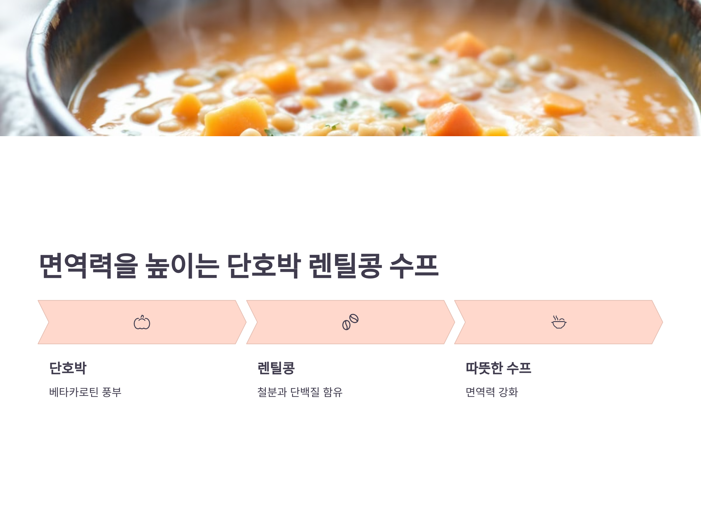 겨울철이나 환절기에는 따뜻한 수프가 큰 위안을 주며, 동시에 면역력 강화에도 효과적입니다. 단호박은 베타카로틴과 비타민 A가 풍부해 항산화 효과가 뛰어나고, 렌틸콩은 철분과 단백질이 풍부하여 피로 회복에도 도움을 줍니다.