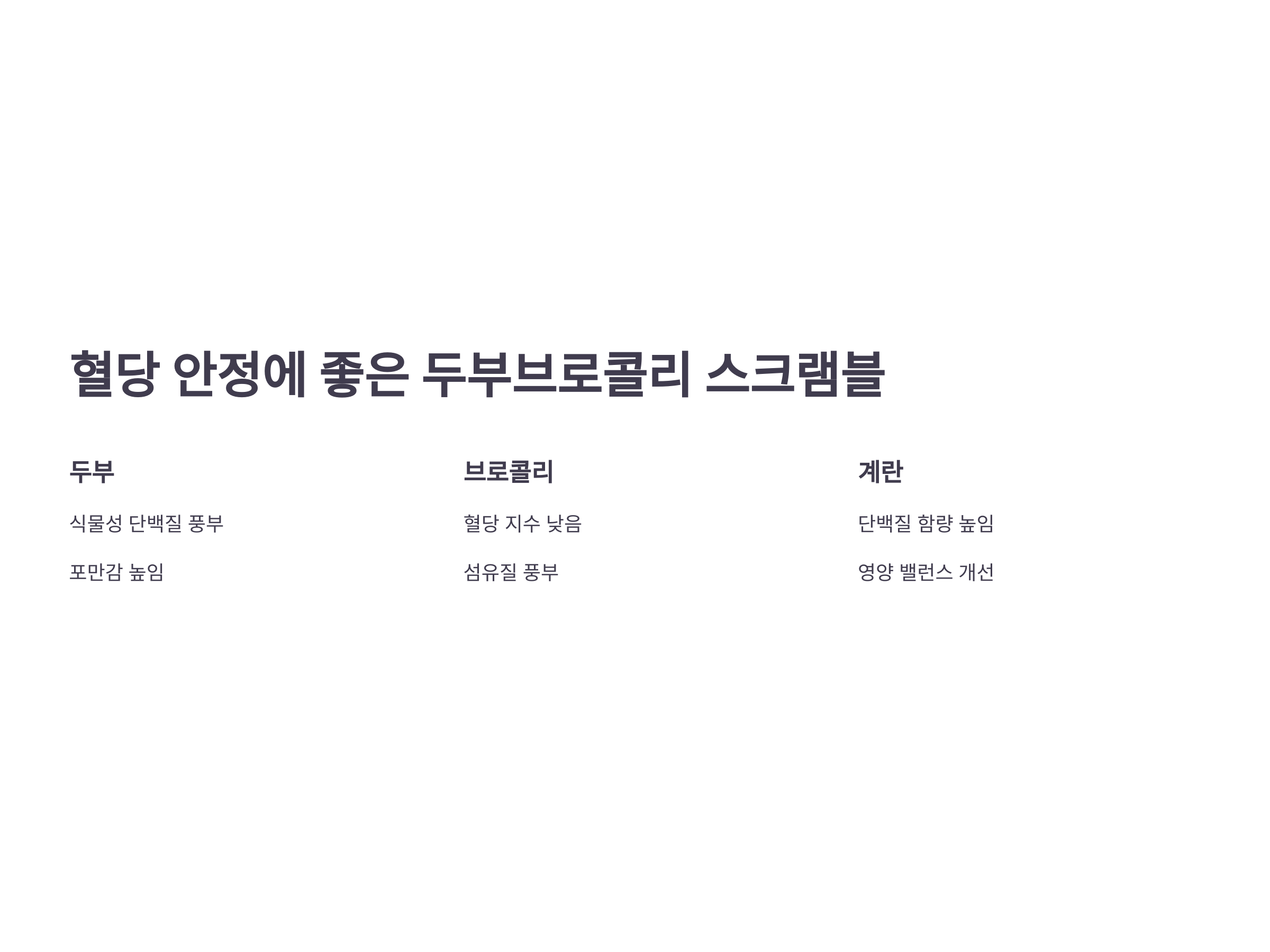 혈당이 자주 출렁이는 현대인에게 두부와 브로콜리는 최고의 조합입니다. 두부는 식물성 단백질이 풍부하며, 브로콜리는 혈당 지수(GI)가 낮고 섬유질이 풍부하여 인슐린 민감도 개선에 도움을 줍니다. 여기에 계란을 추가하면 단백질 함량을 더욱 높일 수 있습니다.