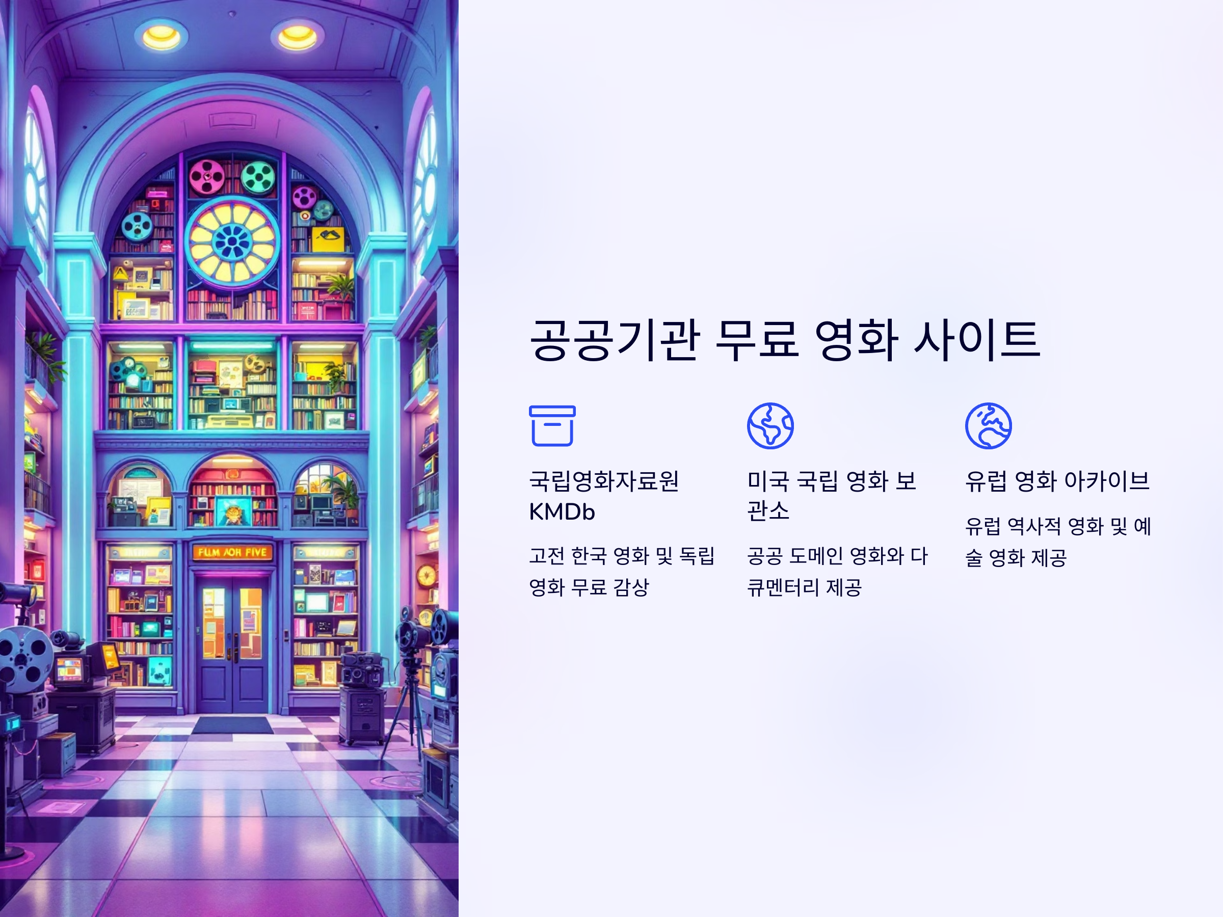 국내외 여러 공공기관에서 운영하는 무료 영화 사이트도 존재합니다. 대표적으로 국립영화자료원, 공공도서관, 해외 영화 아카이브 등이 있습니다.