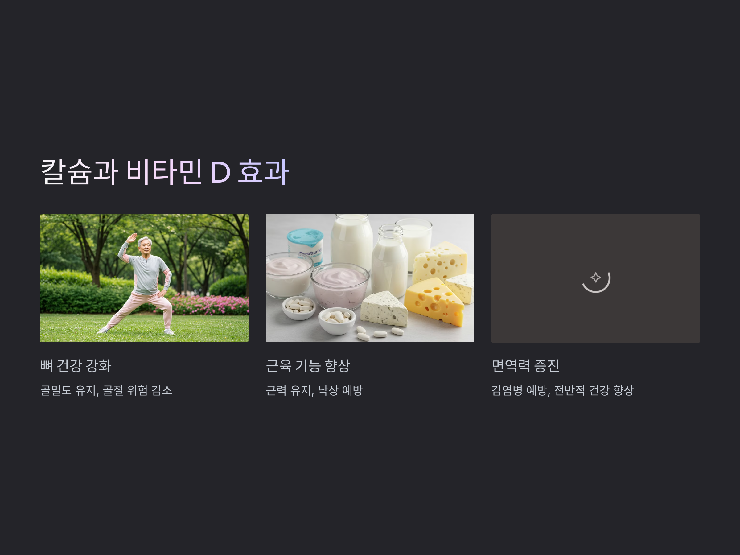 - 칼슘과 비타민 D: 뼈 건강을 유지하는 데 필수적인 영양소입니다. 나이가 들수록 뼈의 밀도가 감소하고, 골다공증 등의 질환에 걸릴 위험이 증가하기 때문에 이들 영양소가 중요합니다.