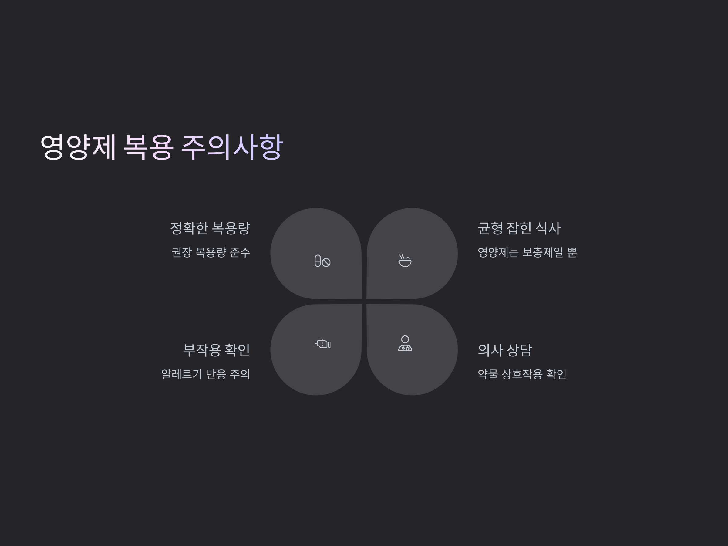 영양제는 보충제로서만 역할을 하며, 건강한 식습관을 대신할 수는 없습니다. 영양제를 복용하는 동시에 균형 잡힌 식사를 통해 필요한 영양소를 충분히 섭취해야 합니다.