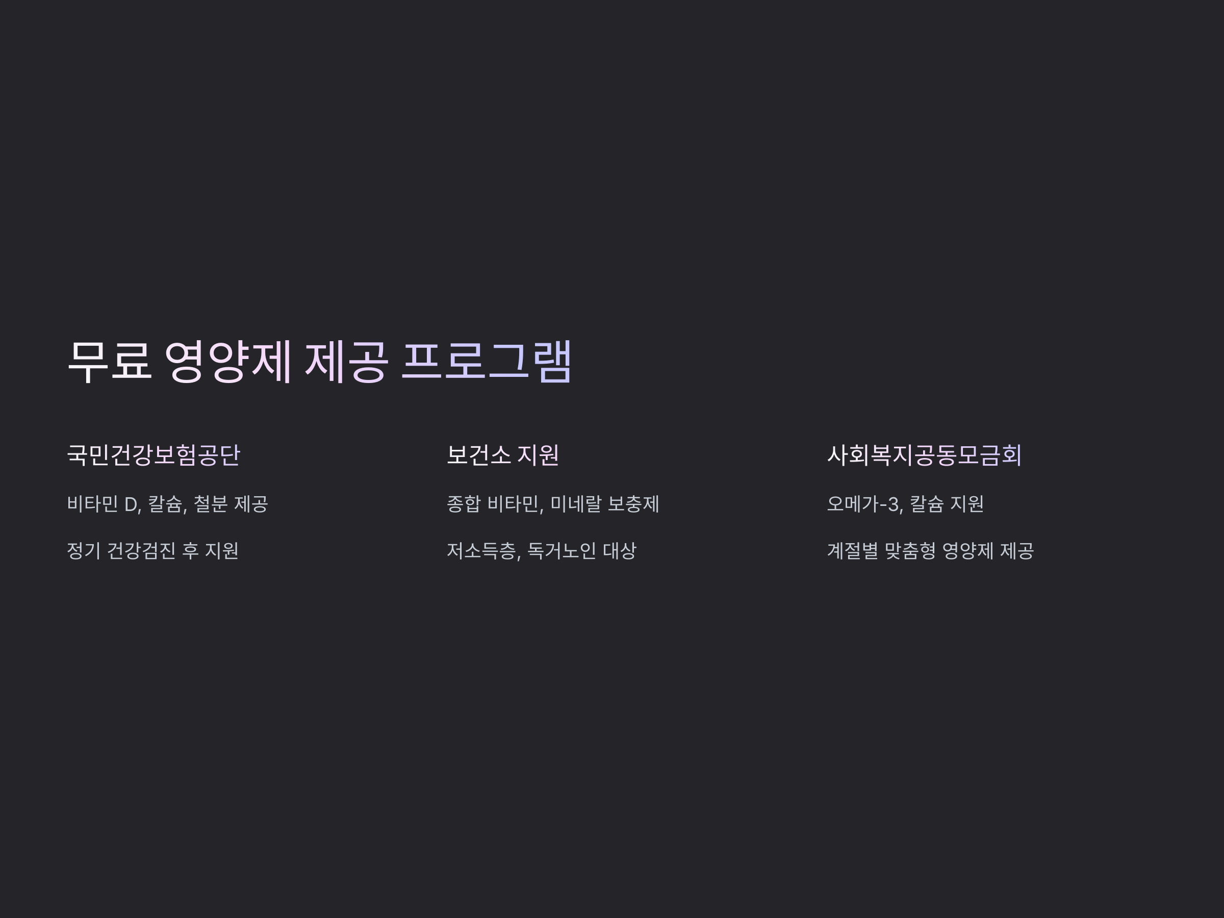 국민건강보험공단은 정기적으로 건강검진을 제공하고, 일부 지역에서는 무료로 영양제를 지원하는 프로그램도 운영합니다. 주로 비타민 D, 칼슘, 철분 등이 포함된 맞춤형 영양제를 제공하며, 이는 노인의 건강을 유지하는 데 중요한 역할을 합니다.