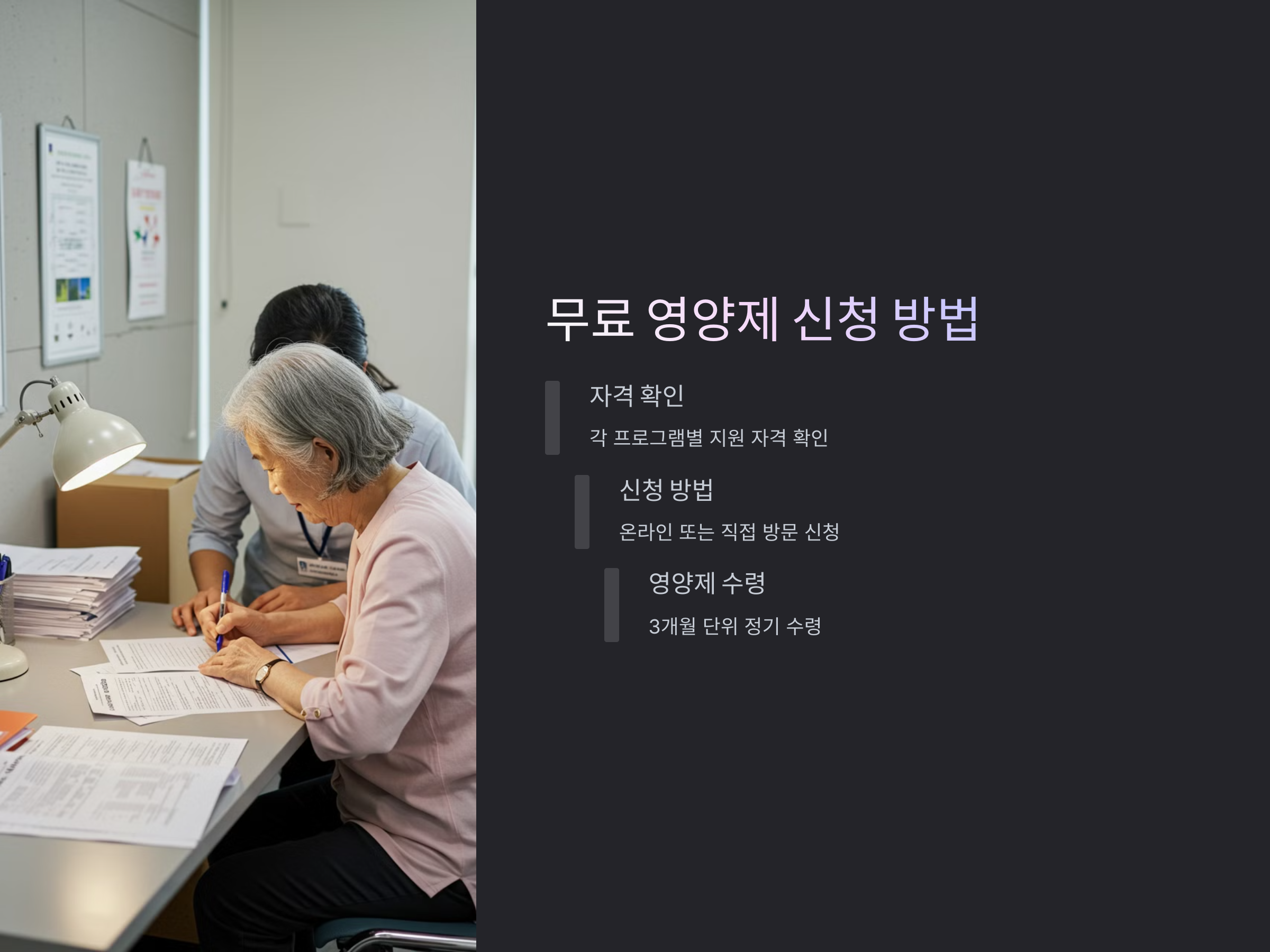 각 프로그램마다 신청 자격이 다릅니다. 예를 들어, 보건소 영양제 지원 프로그램은 저소득층 노인에게 우선 지원되며, 국민건강보험공단의 프로그램은 일정 조건을 충족하는 사람들에게 제공됩니다. 자격 조건을 충족하는지 확인해야 합니다.
