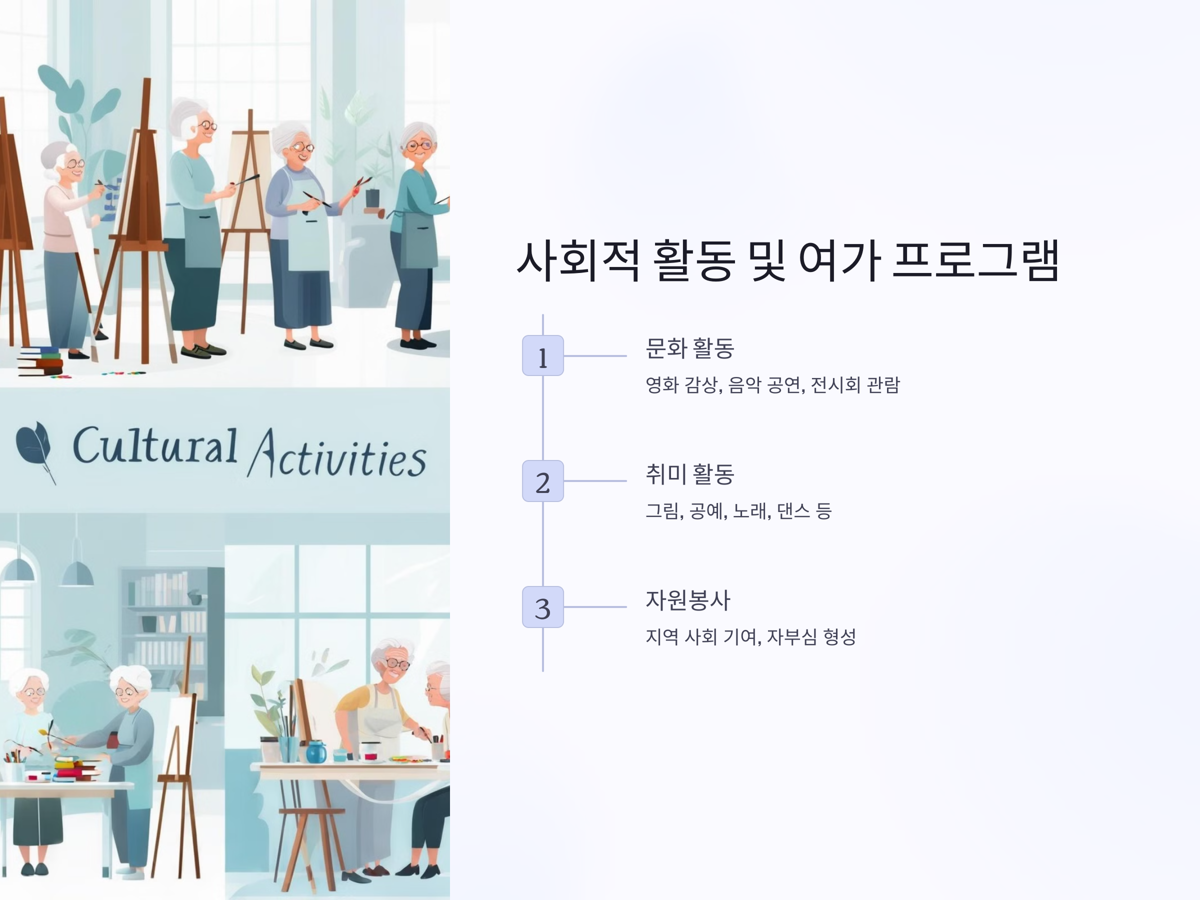 - 여가 활동 프로그램: 영화 감상, 음악 감상, 미술, 공예, 댄스 등 취미 생활을 즐길 수 있는 프로그램입니다.