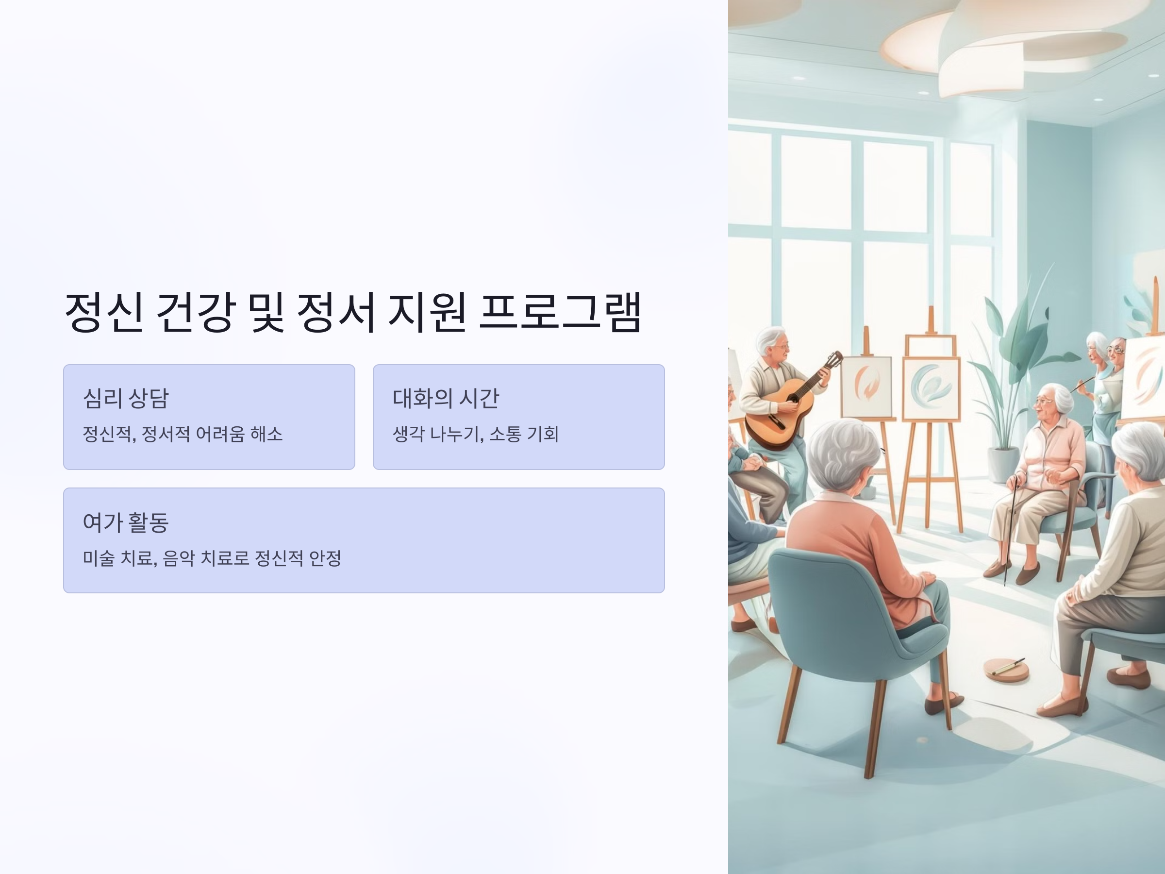 미술 치료, 음악 치료 등 여가 활동을 통한 정신적 안정 프로그램도 제공됩니다. 노인들이 창의력을 발휘하거나 음악을 듣는 동안, 마음의 안정을 얻을 수 있습니다.