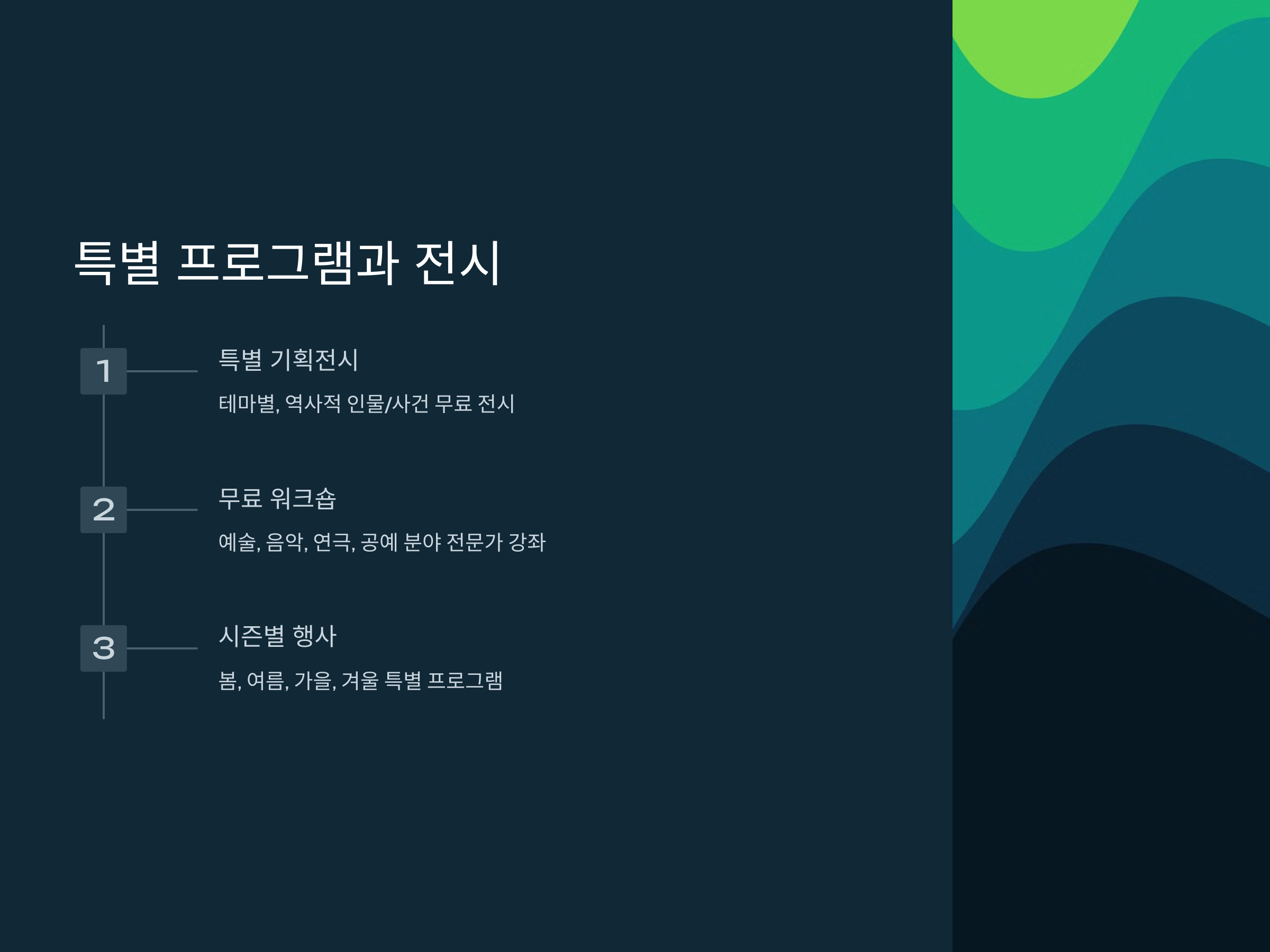 각 박물관과 문화센터에서는 시즌에 맞춰 특별한 행사나 전시를 진행하기도 합니다. 봄, 여름, 가을, 겨울에 따라 다르게 제공되는 프로그램을 놓치지 않으려면 해당 기관의 일정을 체크하고 계획을 세우는 것이 좋습니다.