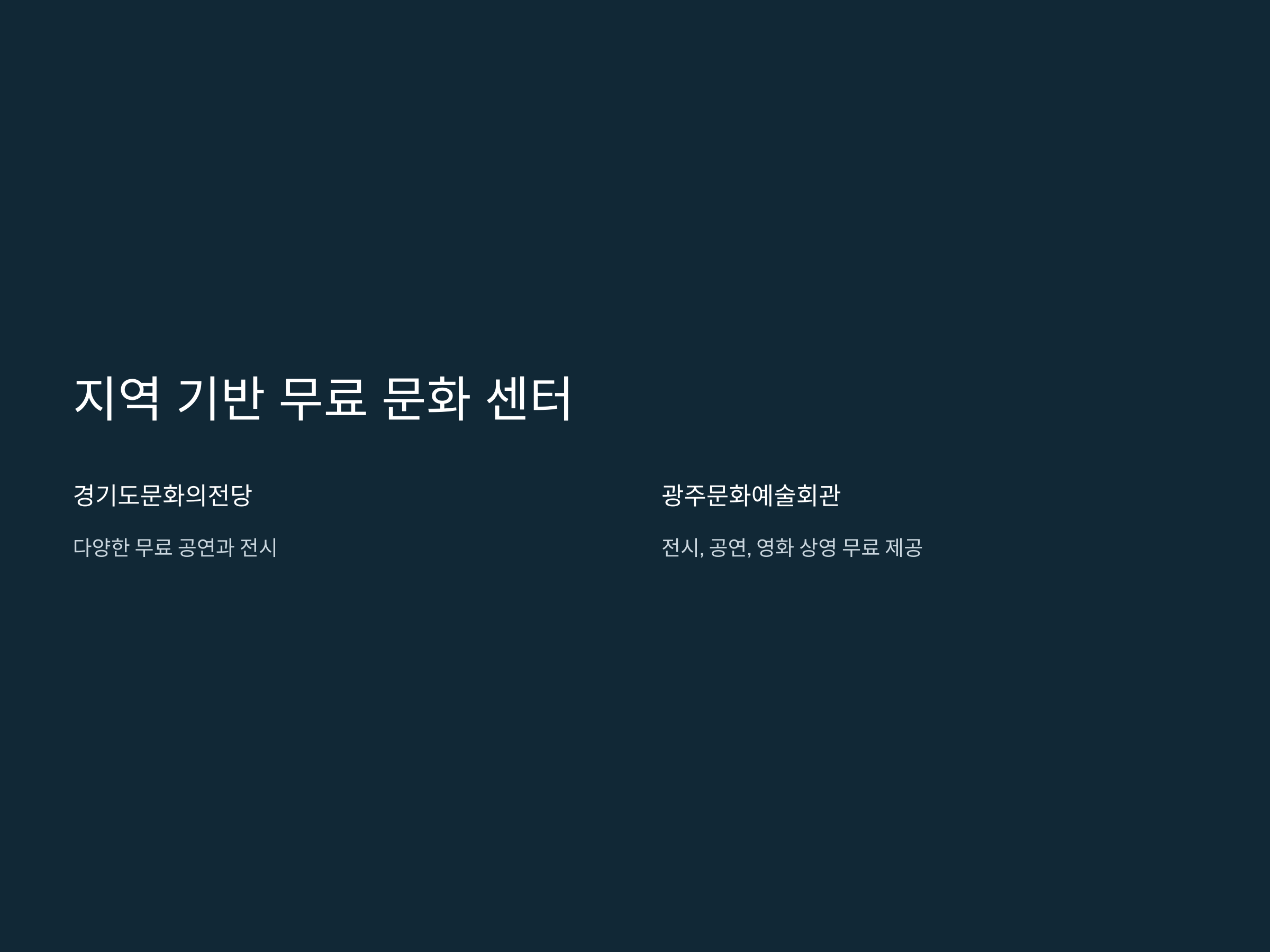 광주문화예술회관은 광주광역시에서 제공하는 무료 문화 프로그램을 운영하는 곳입니다. 이곳에서는 전시, 공연, 영화 상영 등 다양한 문화 행사를 무료로 제공하며, 광주 시민들에게 큰 문화적 혜택을 제공합니다.