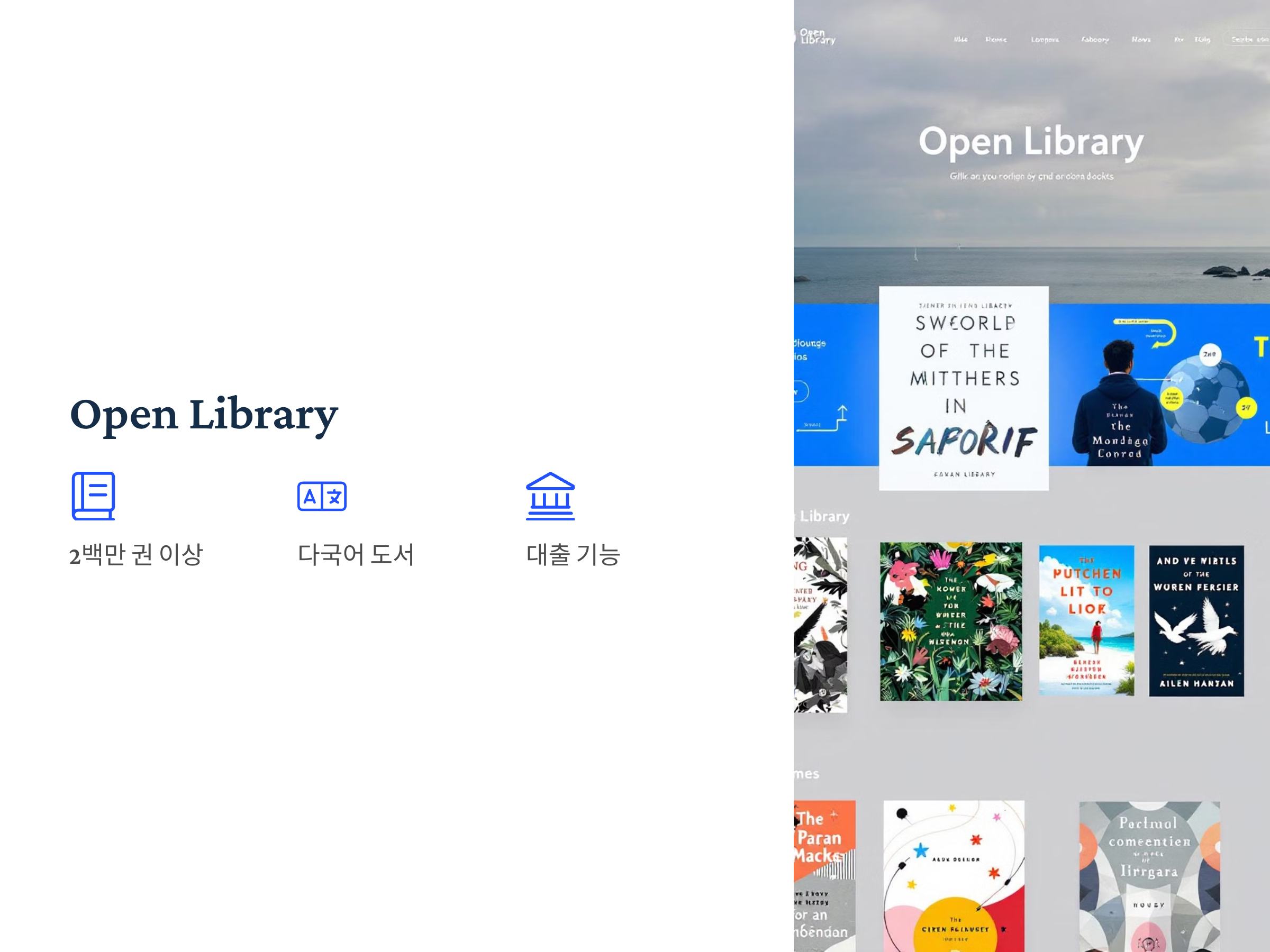 Open Library는 "인터넷 아카이브(Internet Archive)"의 프로젝트로, 전 세계의 책들을 디지털화하여 무료로 제공하는 플랫폼입니다. 이 사이트에서는 2백만 권 이상의 책을 찾을 수 있으며, 그 중 상당수는 전자책 형식으로 무료로 다운로드할 수 있습니다. Open Library는 특히 다양한 언어로 된 책들을 제공하며, 고전부터 최신 도서까지 폭넓은 자료를 갖추고 있습니다.