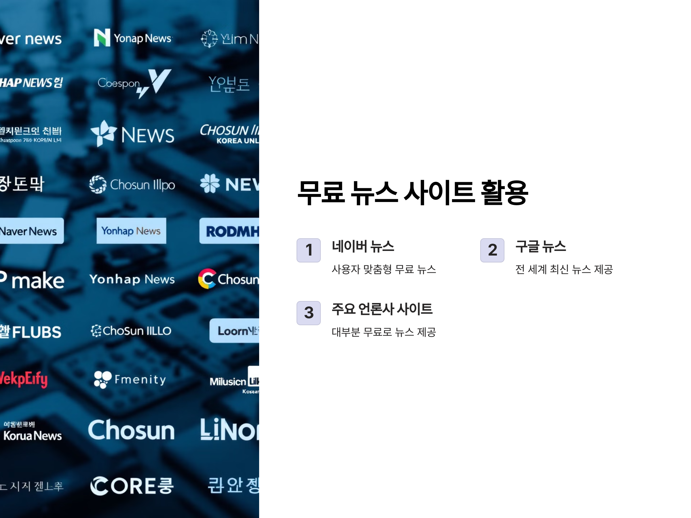 - 구글 뉴스: 전 세계의 최신 뉴스가 한눈에 볼 수 있는 플랫폼으로, 무료로 뉴스를 제공합니다.