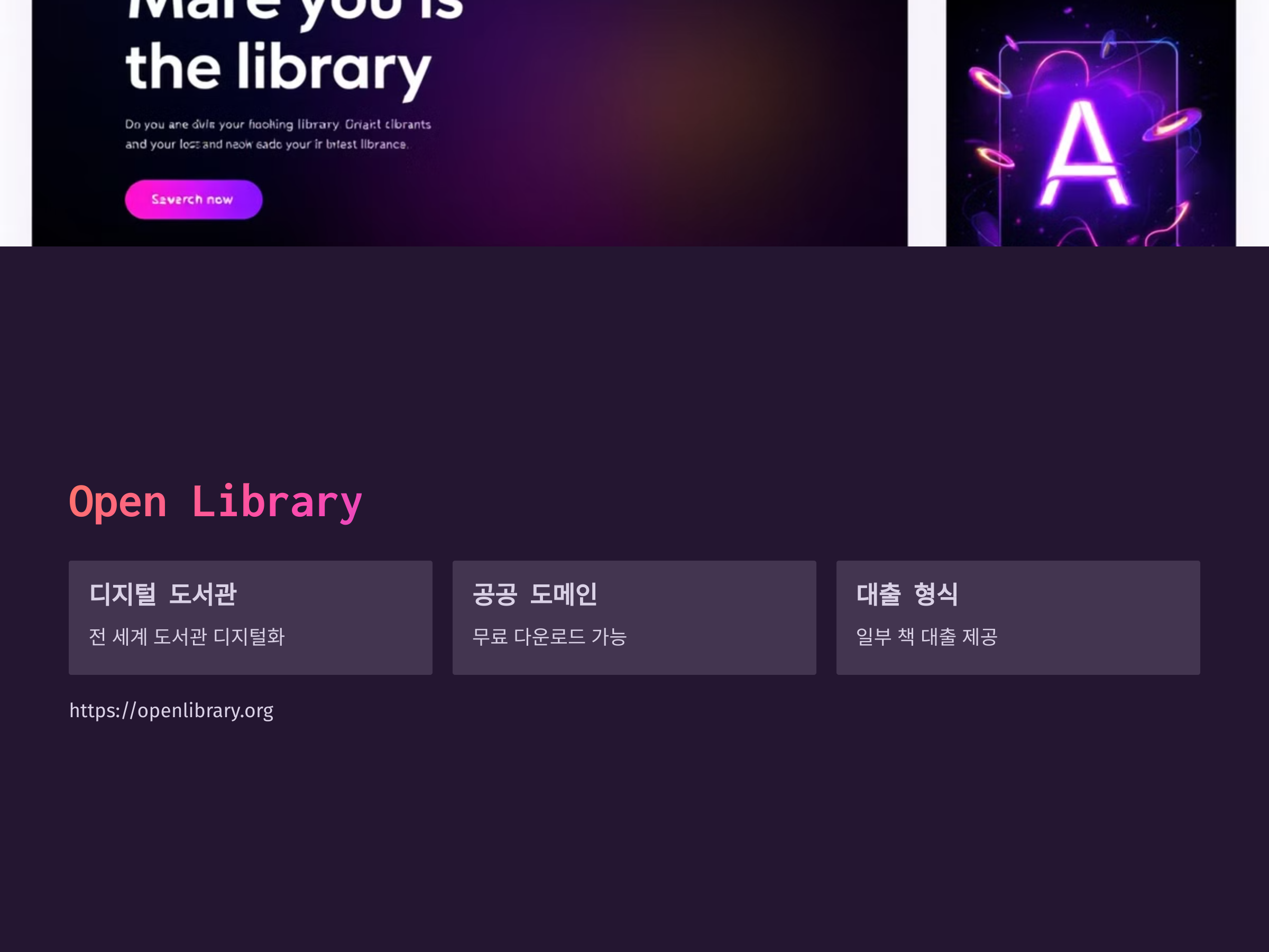 Open Library는 전 세계 도서관에서 제공하는 책들을 디지털화하여 무료로 제공합니다. 또한, 공공 도메인에 속하는 책들을 다운로드할 수 있으며, 일부는 대출 형식으로 제공되기도 합니다.