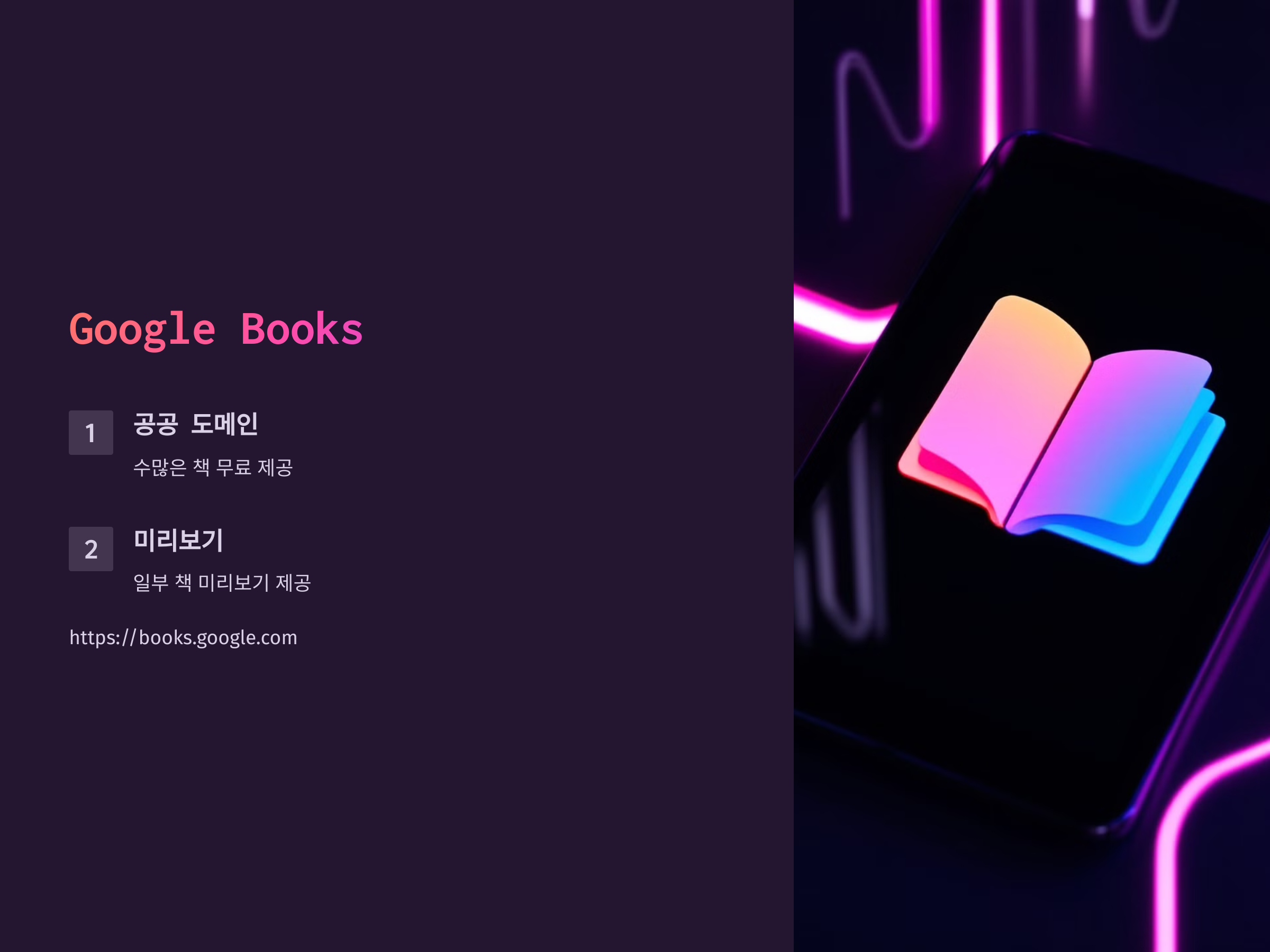 Google Books는 공공 도메인에 속하는 수많은 책을 무료로 제공합니다. 또한, 일부 책은 미리보기 형식으로 제공되며, 무료로 다운로드할 수 있는 전자책도 많습니다.