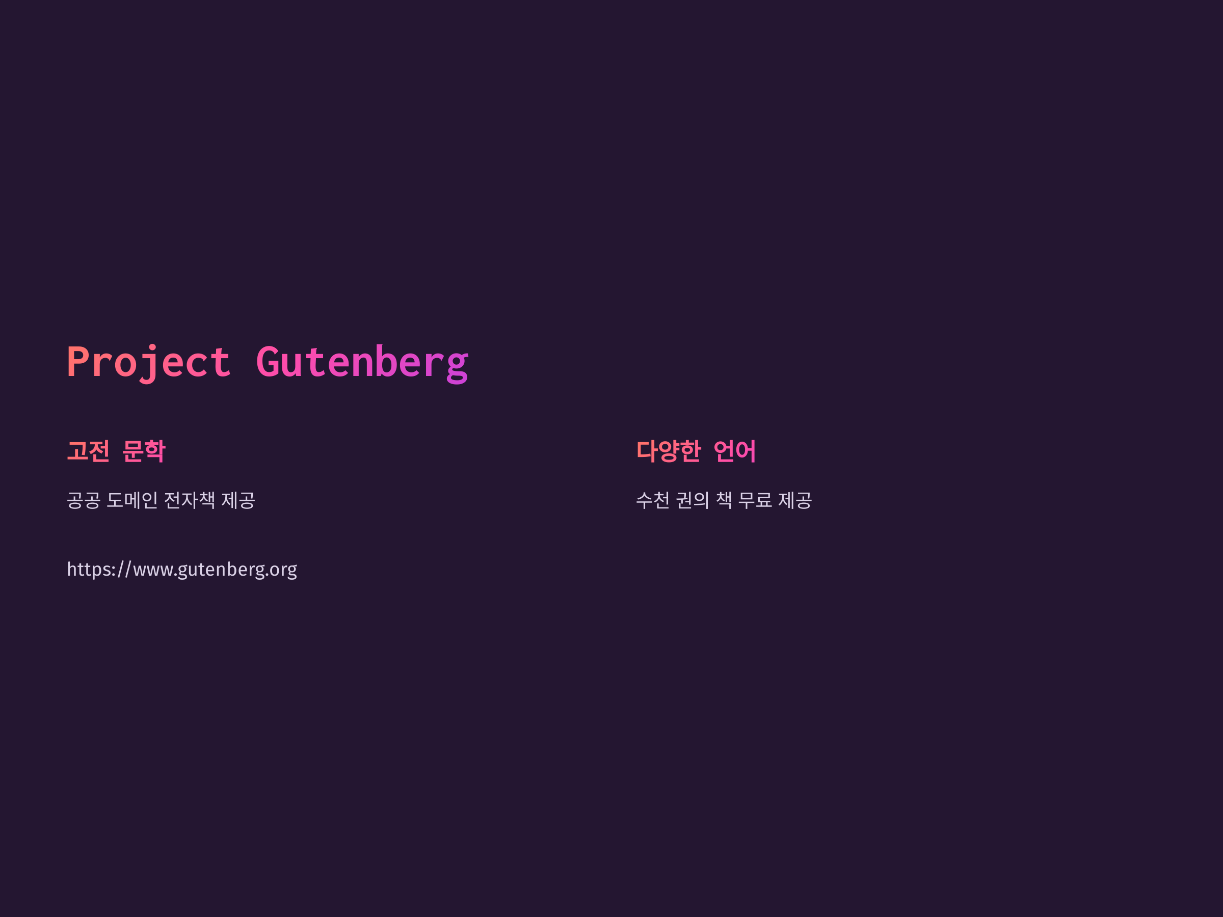 Project Gutenberg는 공공 도메인에 속한 수천 권의 전자책을 무료로 제공합니다. 주로 고전 문학 작품이 많으며, 다양한 언어로 제공됩니다.