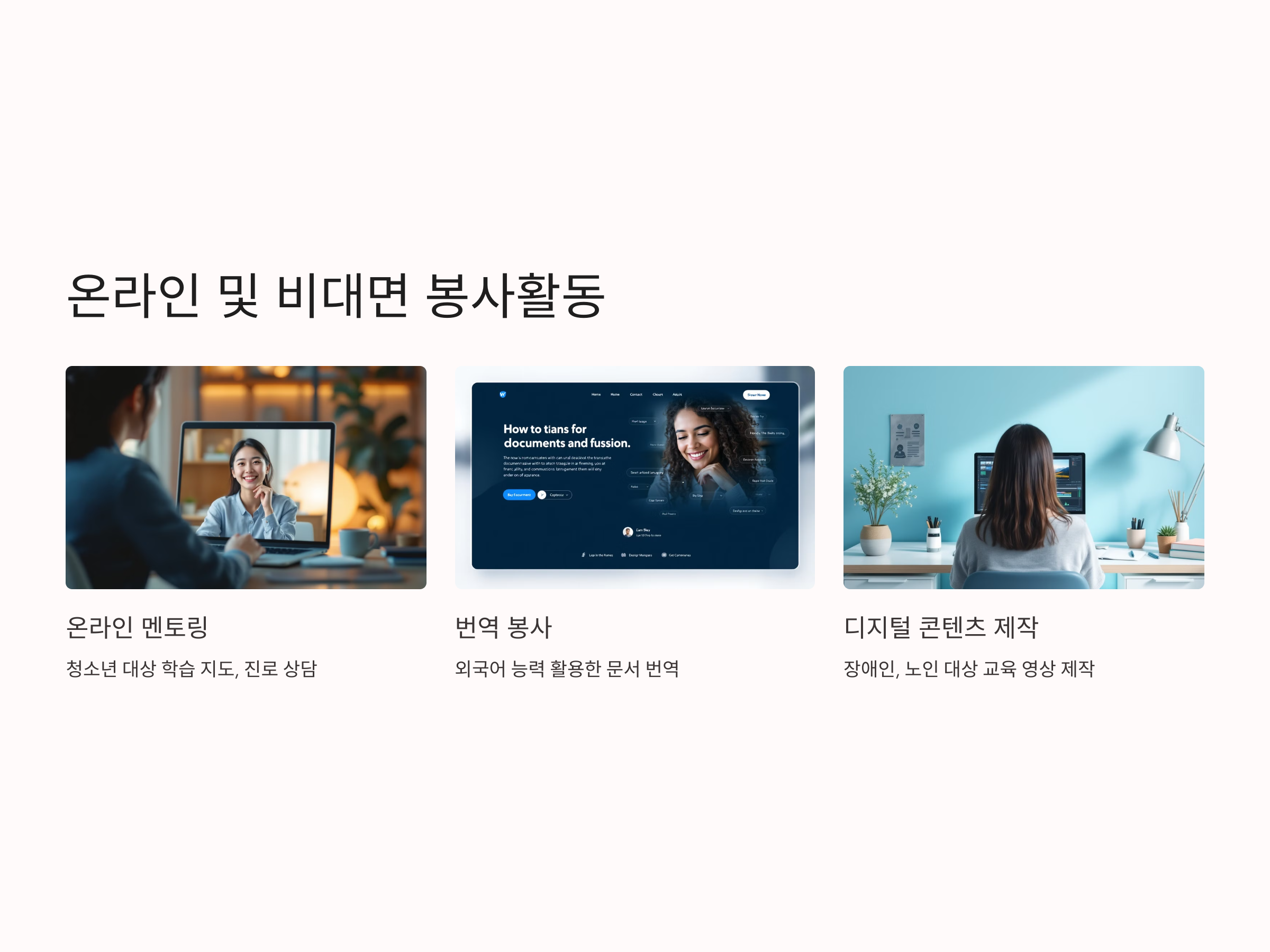 - 온라인 멘토링: 청소년 대상 학습 지도, 진로 상담