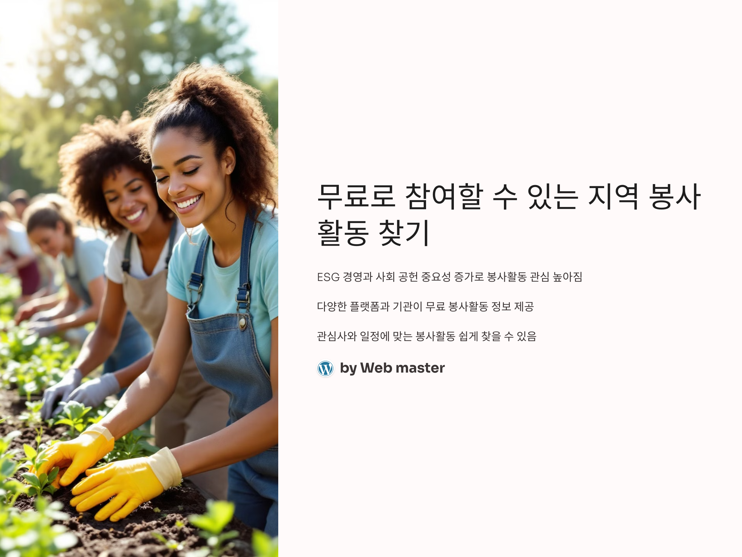 최근 ESG(환경·사회·지배구조) 경영과 사회 공헌이 중요해지면서 지역 봉사활동에 대한 관심이 높아지고 있습니다. 하지만 막상 봉사활동을 하고 싶어도 어디서 정보를 찾아야 할지 막막한 경우가 많습니다. 다행히 다양한 플랫폼과 기관이 무료로 참여할 수 있는 봉사활동 정보를 제공하고 있으며, 이를 활용하면 본인의 관심사와 일정에 맞는 봉사활동을 쉽게 찾을 수 있습니다. 이번 글에서는 지역 봉사활동을 찾는 방법부터 신청 절차, 활동 팁까지 한눈에 정리해드립니다.